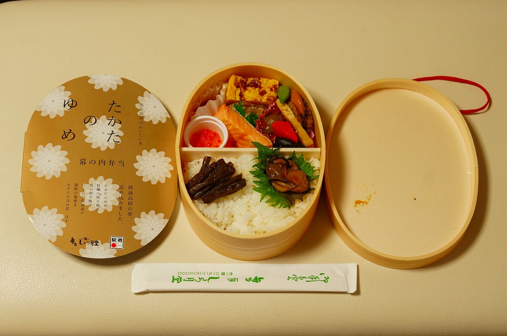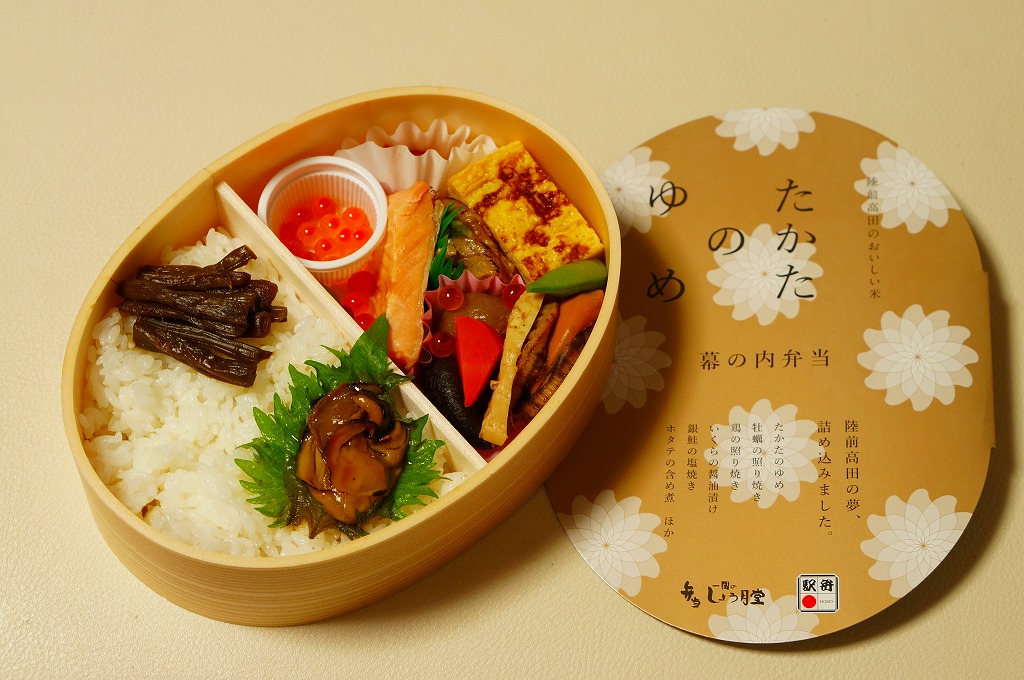 2014(平成26)年12月11日に盛岡駅と一ノ関駅で発売、ほどなく東京駅や東北新幹線の車内販売でも販売。岩手県陸前高田市のみで2013(平成25)年から作付けされる米の商標が、そのまま駅弁の名前となった。楕円形の容器の半分にその白飯を詰め、三陸産カキ照焼とフキを載せ、半分にホタテ煮、鮭塩焼、玉子焼、イクラ、煮物、漬物を詰めた。駅弁の名前や東京での販売から、東日本大震災の震災復興関連商品を思わせるが、そんな見せ方も売り方もしていない、見ても食べてもおいしくて、御飯が主体かつ主役で実用的な駅弁。カキのシーズン終了を理由に2015年4月限りで販売を休止、そのまま売り止めてしまった模様。