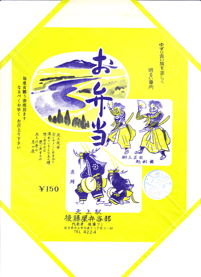 1960年代の、7月22日6時の調製と思われる、昔の北上駅弁の掛紙。北上川、鬼剣舞、鹿踊(ししおどり)を描き、北上夜曲を記す、郷土の駅弁掛紙。