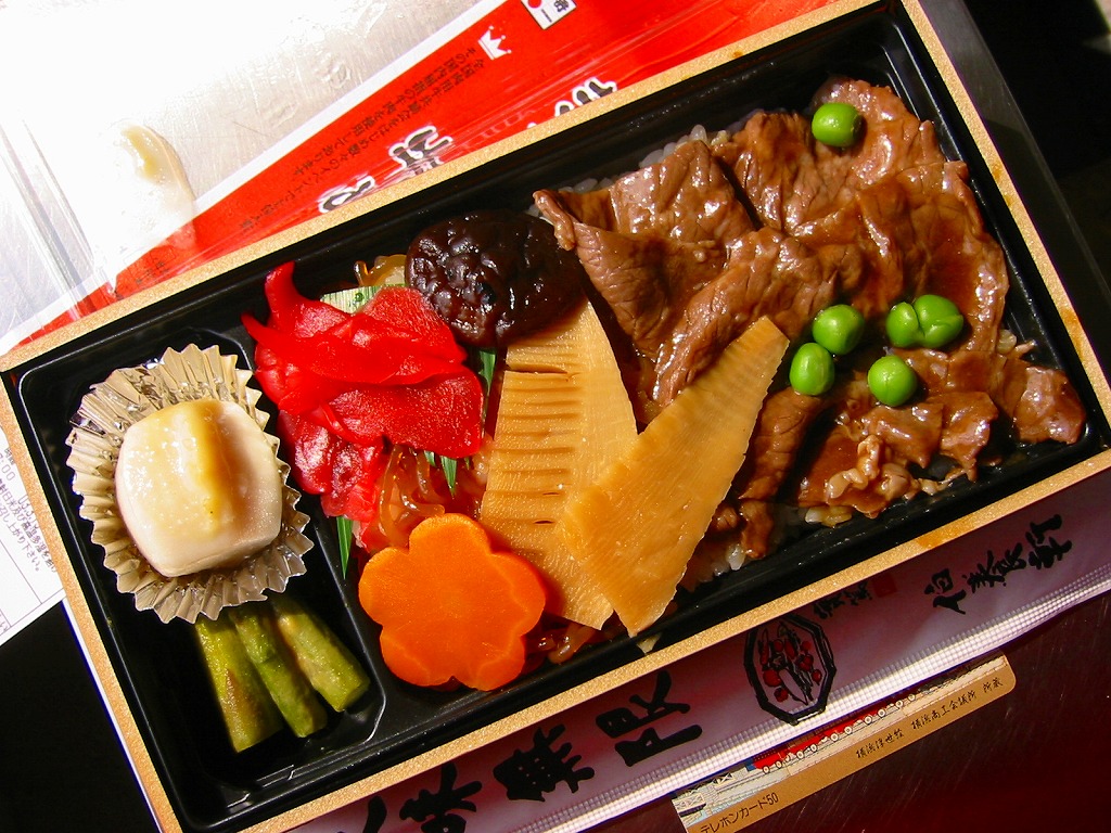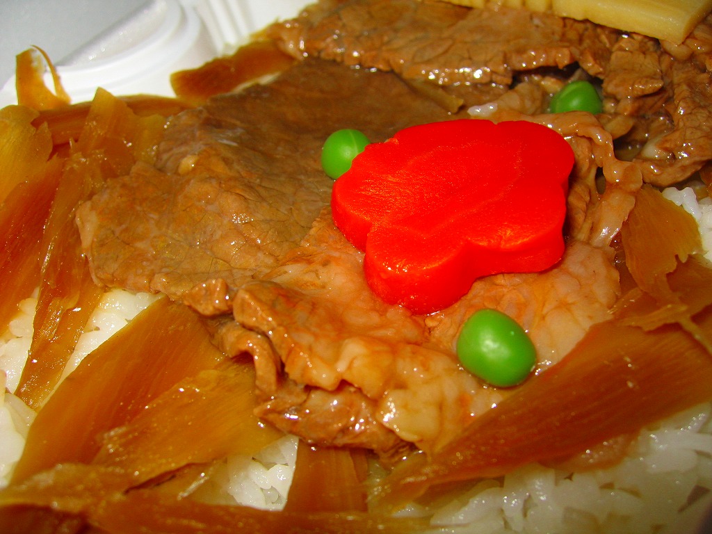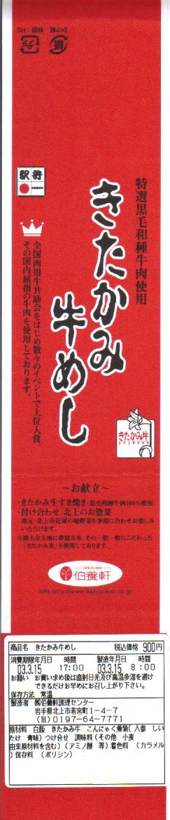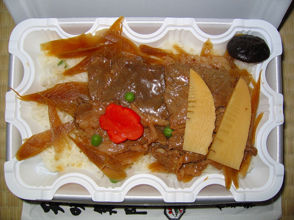 2003(平成15)年3月1日の発売。惣菜弁当や駅弁でよく使われる、ふたが透明な長方形の容器に、駅弁の名前を記した紙帯を締める。中身は北上産ひとめぼれの御飯の上を、「きたかみ牛」のすき焼きや白滝やタケノコや椎茸で覆い、北上名産の二子イモ煮やアスパラガスのマスタード和えを添えるもの。柔らかく軽い口当たりの牛肉は、あんかけ風のタレでますます軽く、その食感から肉の分量を必要以上の少なく感じさせるほど。