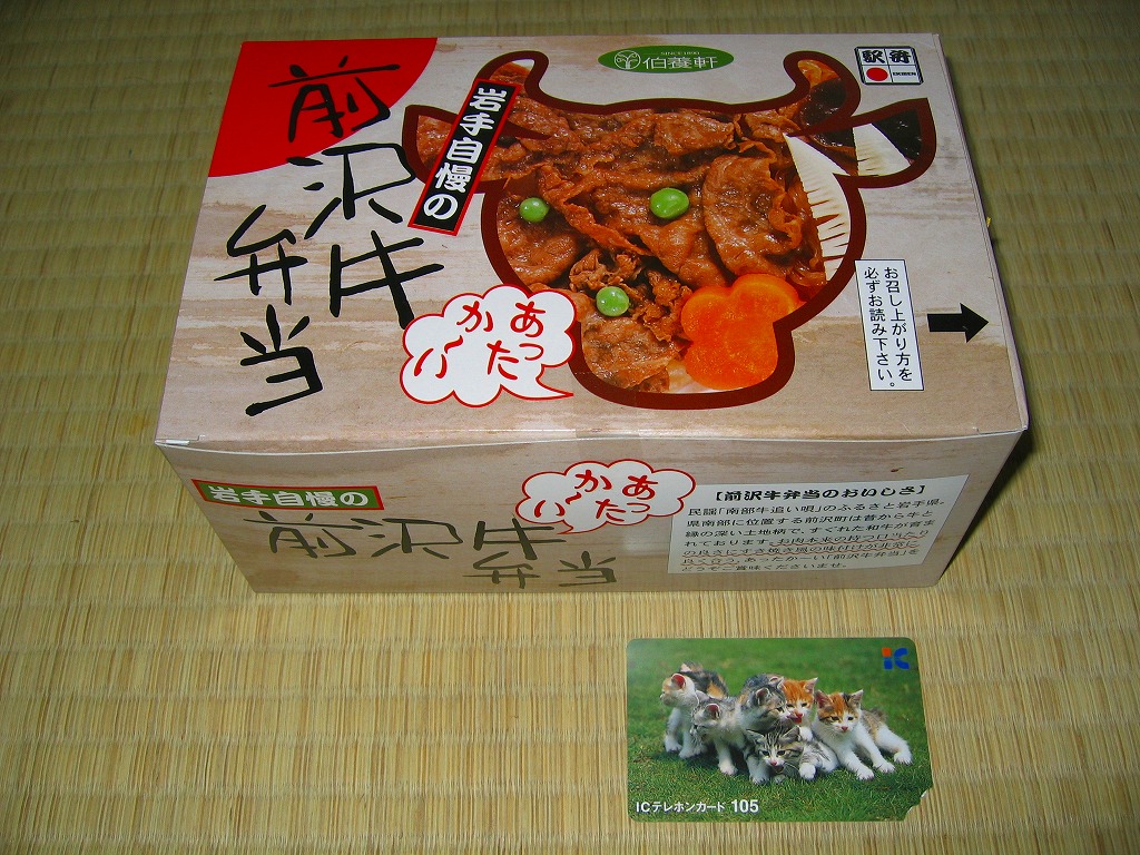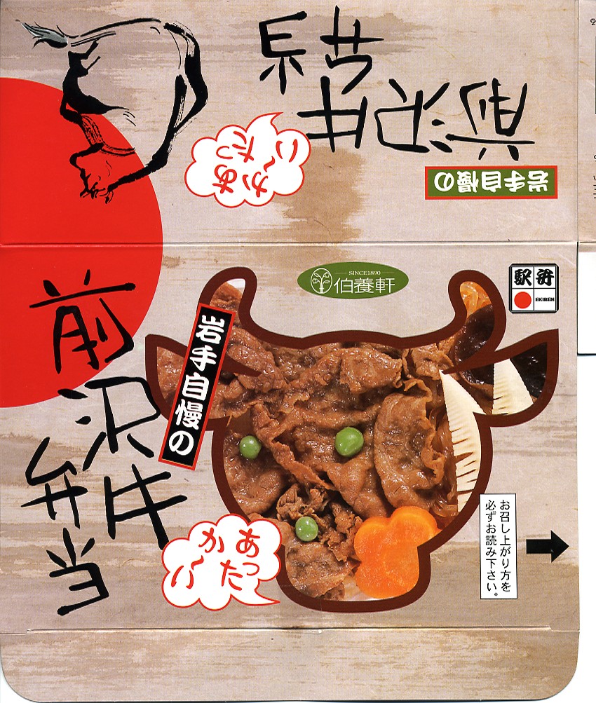 デパートの弁当大会で購入した、製造者が仙台支店で販売者が北上支店の駅弁。長方形の加熱機能付き容器を、中身の一部写真を牛型に載せたボール紙のパッケージに入れる。中身は白御飯の上にすき焼き風味の前沢牛焼肉が少々と、ごぼうやタケノコやにんじんなど。中身は見た目に寂しいが、柔らかくて良い肉が使用されているので美味い。しかし本当に北上駅で買えるかどうかは、やや疑問。なお、調製元の支店は経営不振による事業譲渡により、2005年7月31日限りで終売となった。