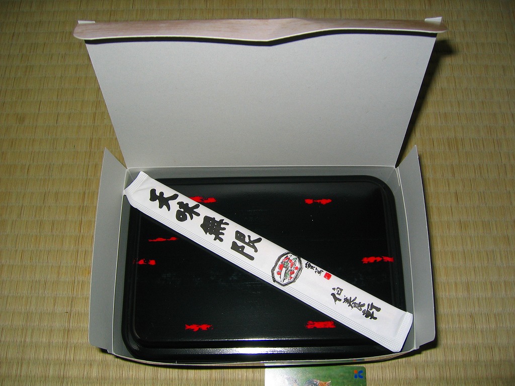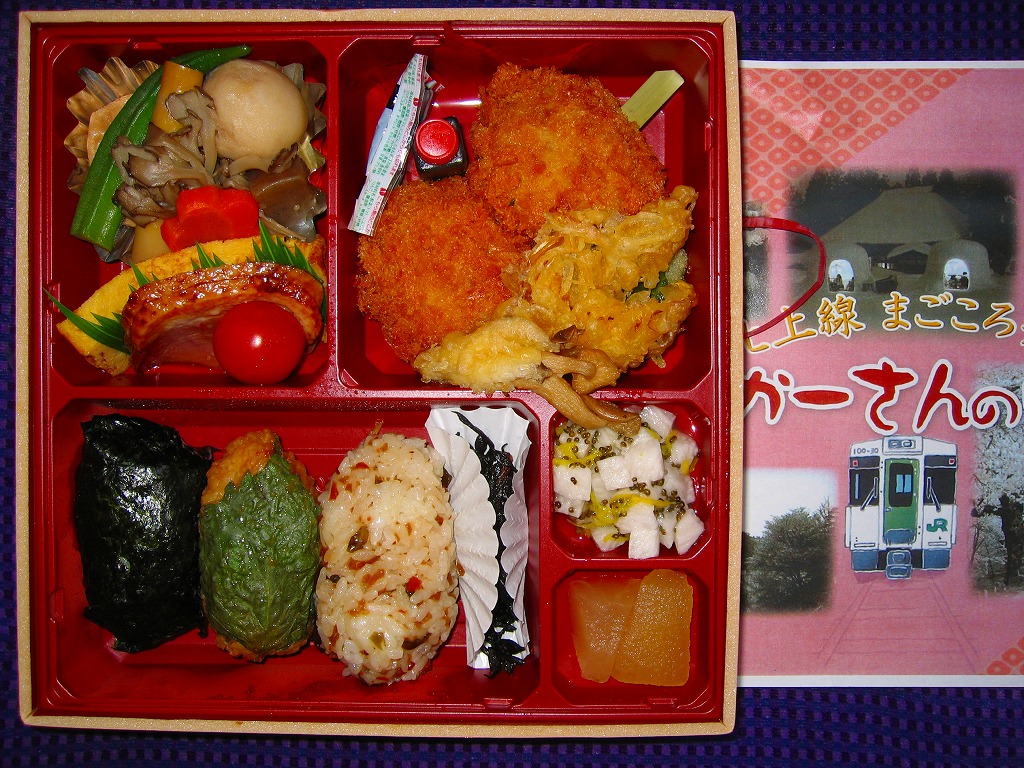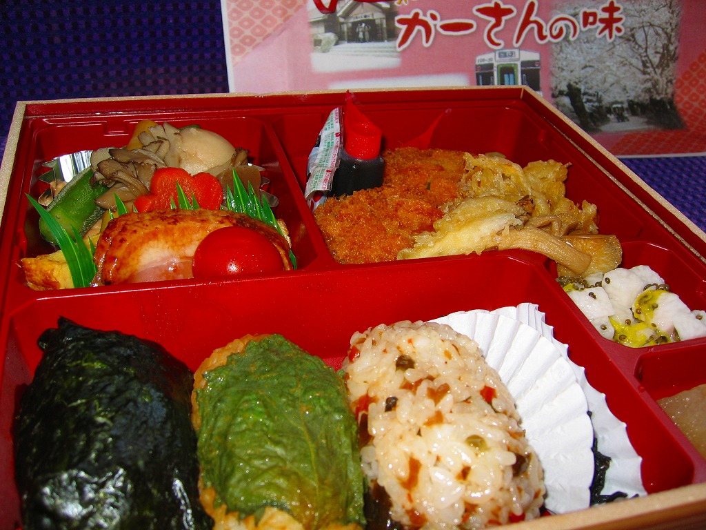 2006(平成18)年に発売か。大きめの容器に透明なふたをして、A4判カラーコピーの掛紙をかけて、輪ゴムで留めてから食品表示ラベルを貼る。中身は小柄な白飯おにぎり、ほろほろ漬おにぎり、大葉焼きおにぎりと、牛メンチカツ串、かき揚げ、舞茸その他の煮物、合鴨桑焼に玉子焼、とろろいもにリンゴシロップ漬けなどと盛りだくさん。