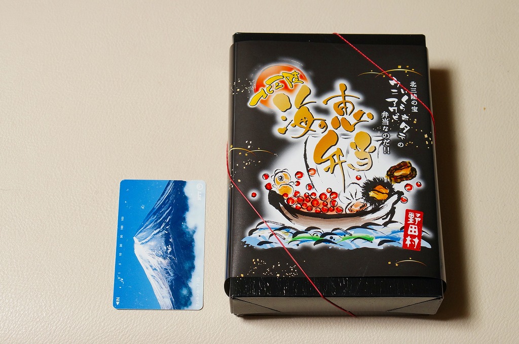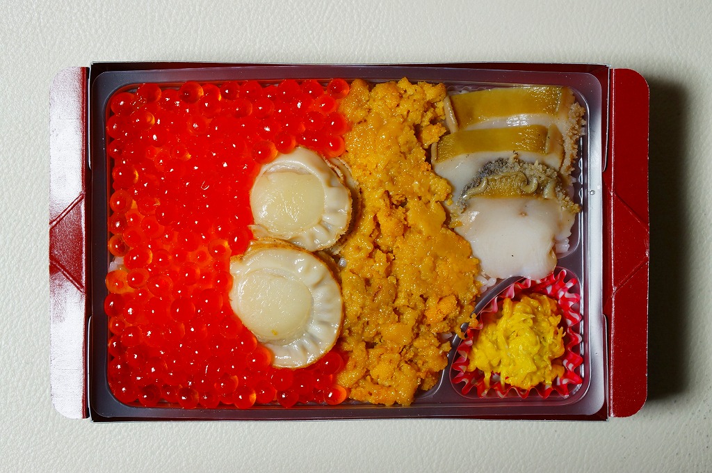 2015(平成27)年1月の京王百貨店の駅弁大会で、陸中野田駅の駅弁として実演販売。現地の道の駅でも、1月8日の開会から一日10個を、1月31日までの期間限定で販売したという。白御飯を、上記の「鮭いくら弁当」のイクラとホタテと、さらにウニとアワビで覆い、食用菊と醤油を添付。黒い掛紙のイラストが楽しく、輝かしい中身。イクラの塩気、ホタテのぷりぷり、ウニの滋味、アワビの臭みは、駅弁にも海鮮弁当にもない感覚で、久慈のうに弁当に負けず劣らずという感じ。以後の販売は、なかった模様。