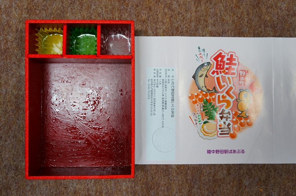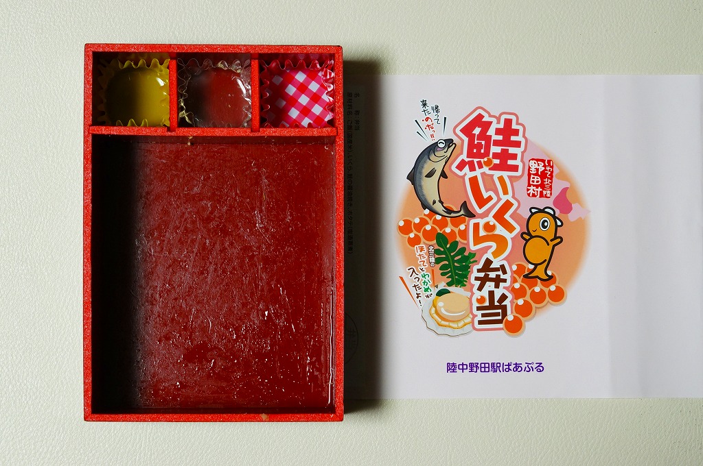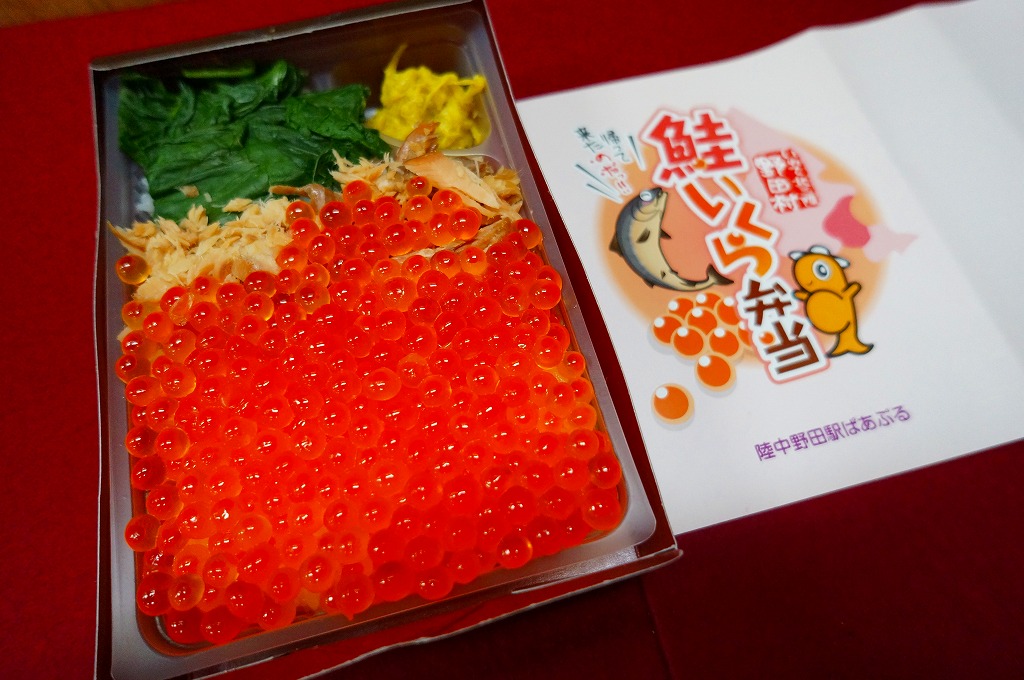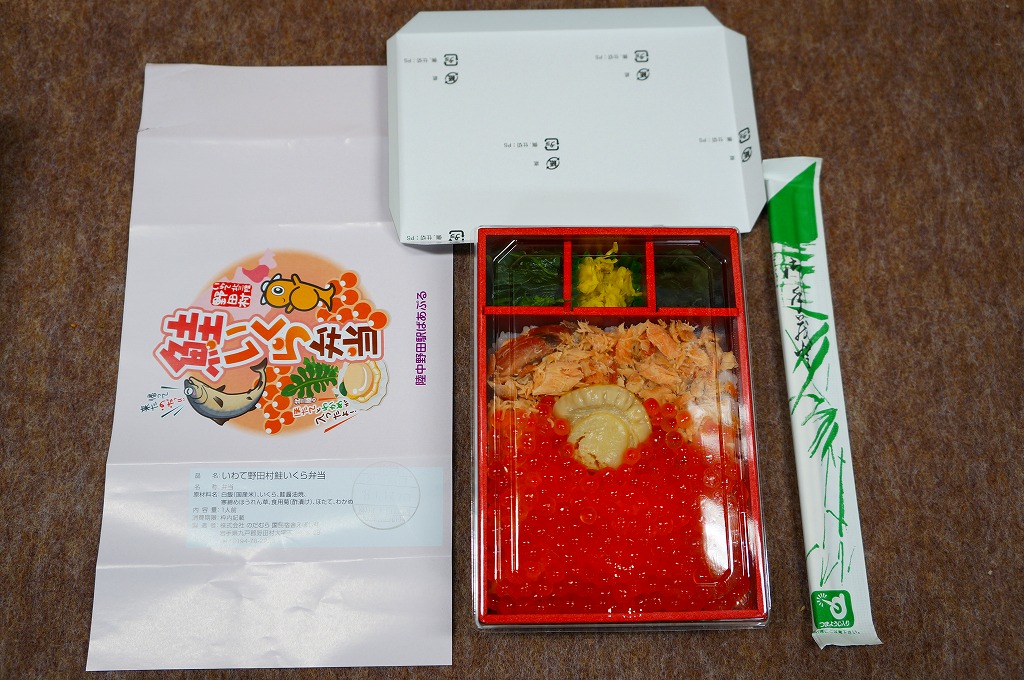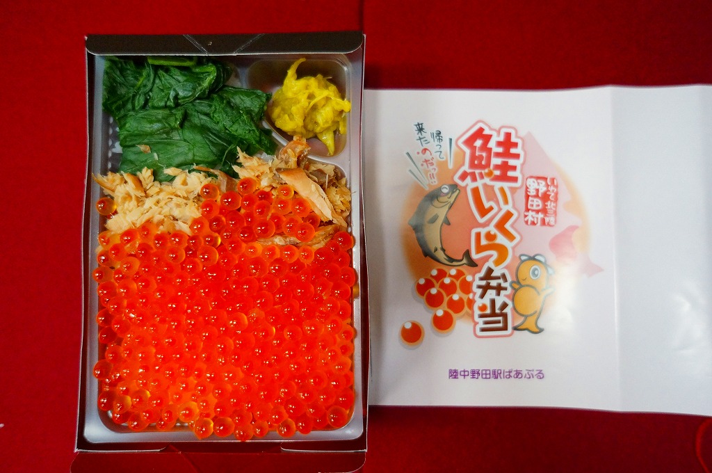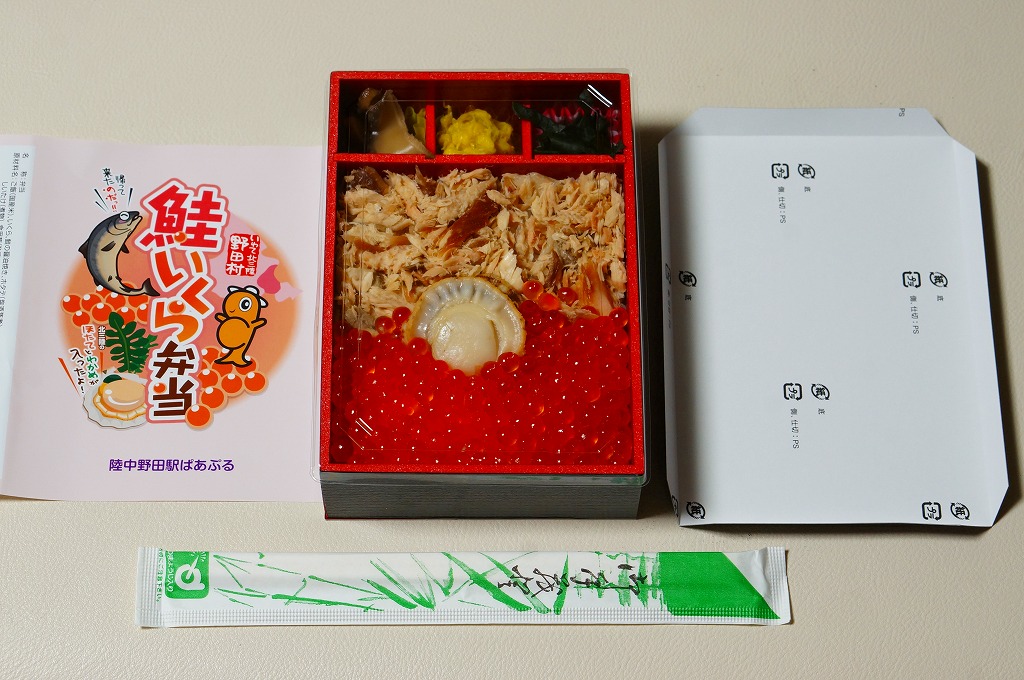 黒色の容器に、中身と駅弁の名前と野田村の位置でデザインした、鮭色の掛紙を巻く。中身は白御飯を、鮭の醤油焼きのフレークとイクラで覆い、ホタテの塩酒蒸煮をひとつ据え、シイタケ煮、塩ワカメ、食用菊の酢漬けを添えるもの。主役はきっと、三陸産のイクラ。しかしこの弁当の味の特徴はきっと、サケにある。フレークが大粒で、身の旨味がしっかり広がり、飯が進んだ。