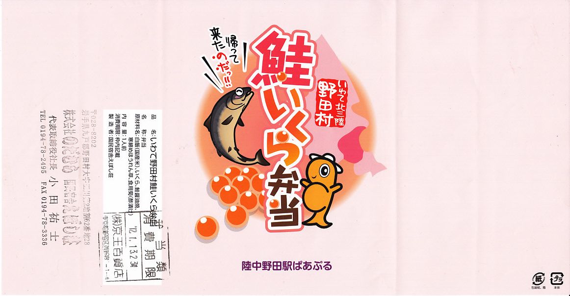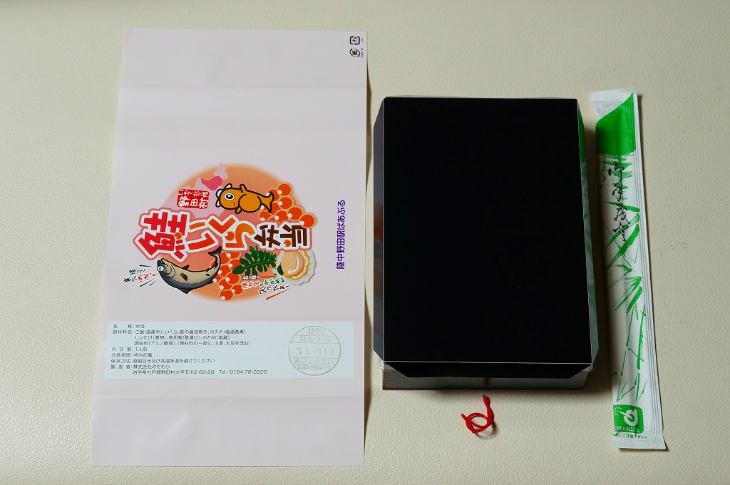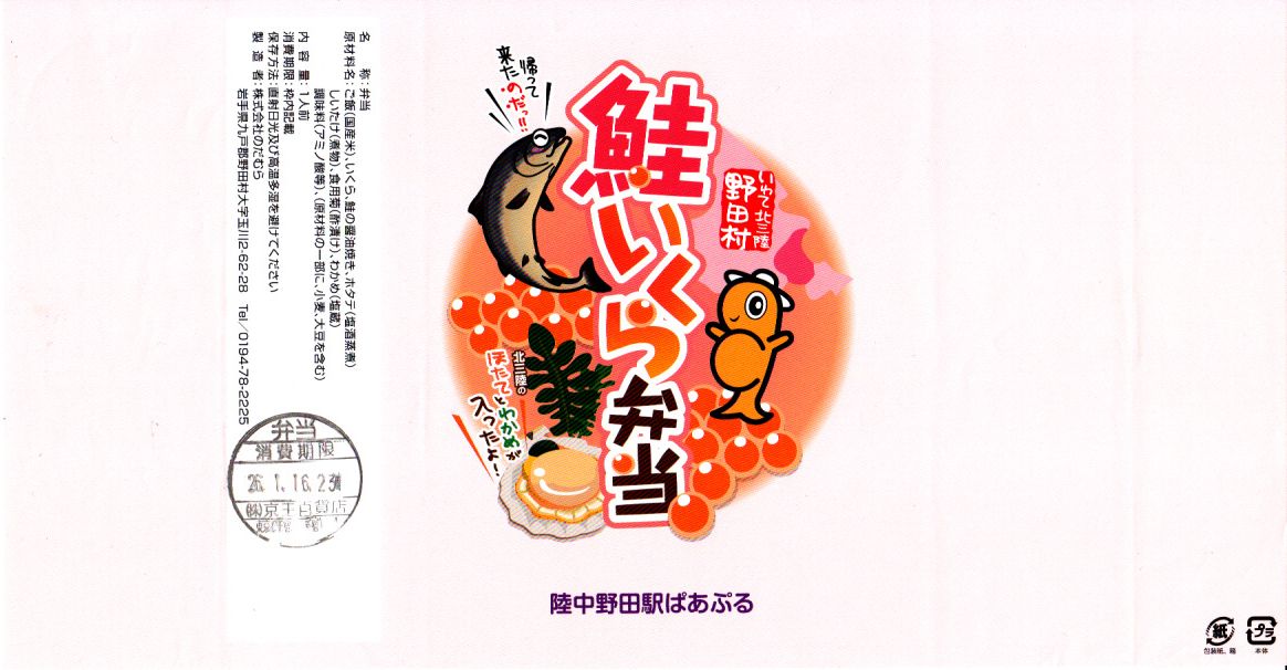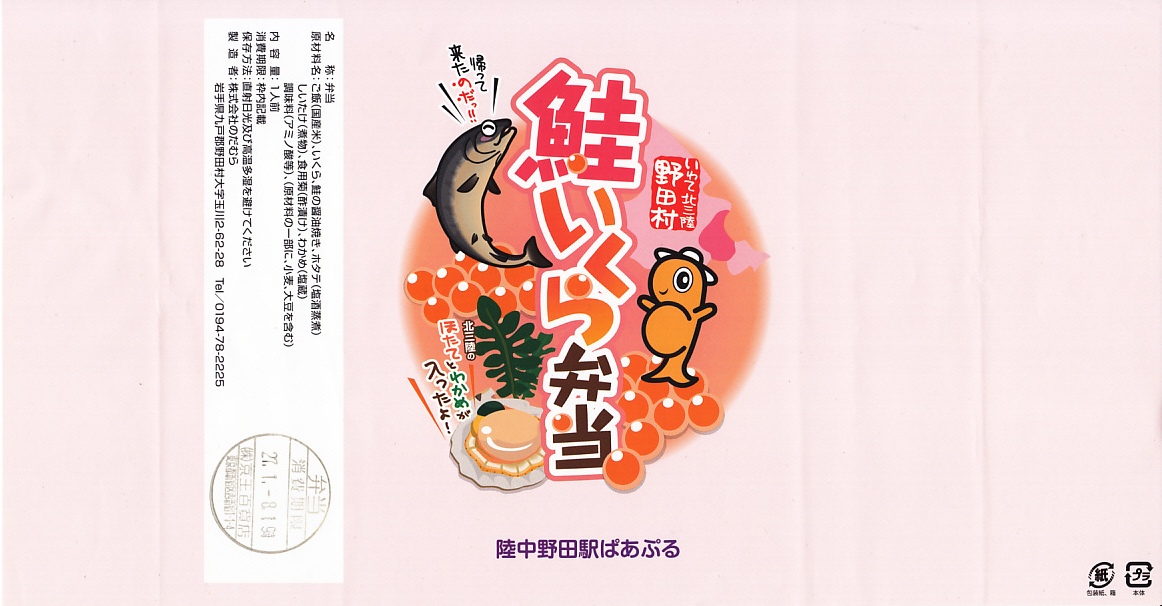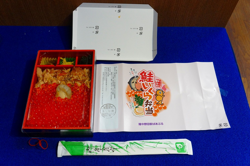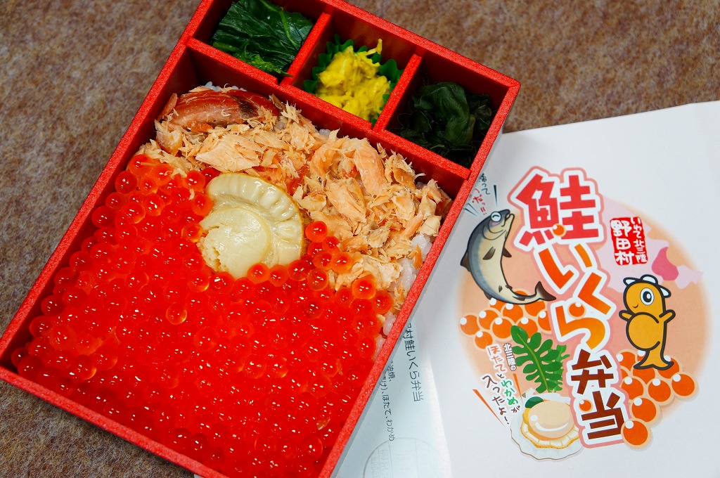 黒色の容器に、中身と駅弁の名前と野田村の位置でデザインした、鮭色の掛紙を巻く。中身は白御飯を、鮭の醤油焼きのフレークとイクラで覆い、ホタテの塩酒蒸煮をひとつ据え、シイタケ煮、塩ワカメ、食用菊の酢漬けを添えるもの。主役はきっと、三陸産のイクラ。しかしこの弁当の味の特徴はきっと、サケにある。フレークが大粒で、身の旨味がしっかり広がり、飯が進んだ。