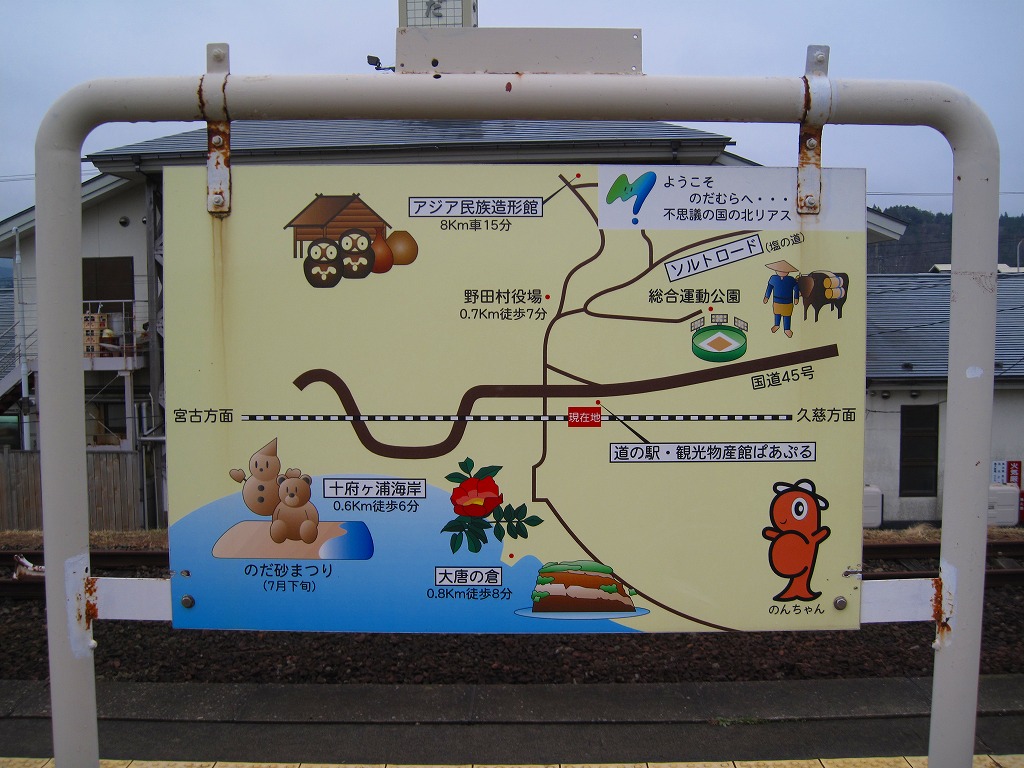 久慈駅から三陸鉄道北リアス線で2駅13分。野田村は岩手県で太平洋に面した人口約4千人の村で、かつては製塩や砂鉄で栄え、今は農業と漁業と観光で生きる。2012年1月の京王百貨店の駅弁大会に出品するため、駅舎の機能も持つ道の駅で駅弁が誕生した。1975(昭和50)年7月20日開業、岩手県九戸郡野田村大字野田。