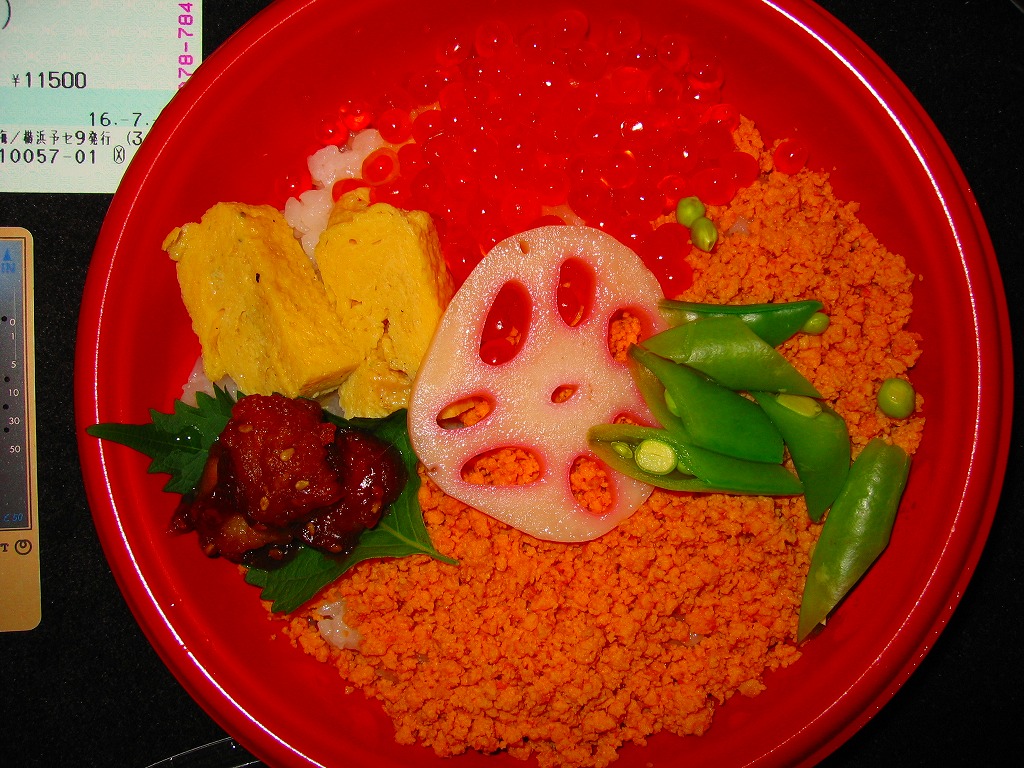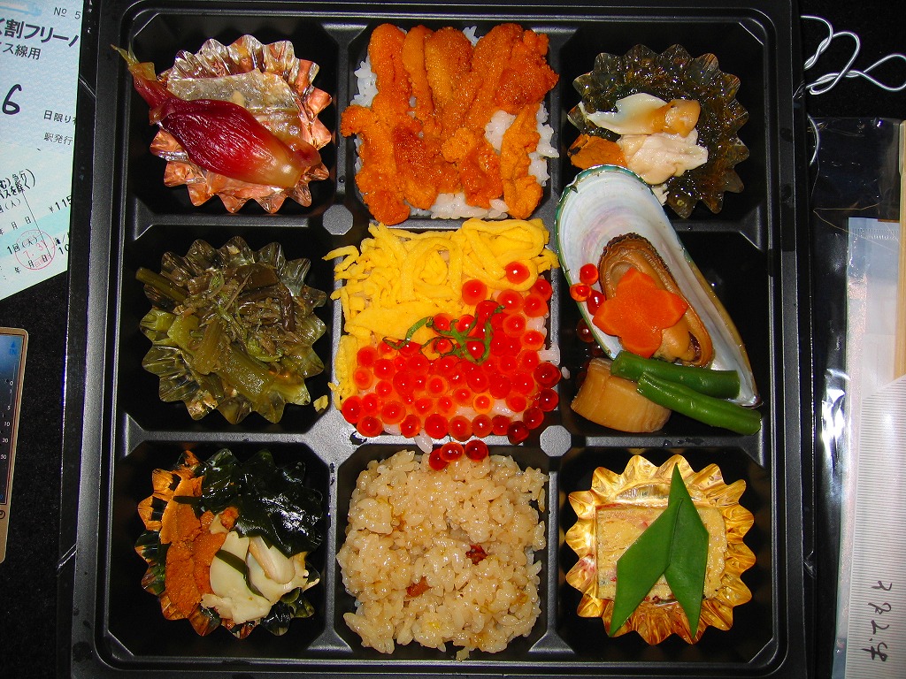一部の駅弁屋でも使われる紙箱トレー入りの市販の特選惣菜弁当用容器を使用。中身はタコ添え菊花茶飯にイクラ飯にウニ飯と三種の御飯が入り、アワビやワカメやウニの和え物に、帆立貝柱にムール貝、海草二種の片方に載るのはホッキだろうか、焼鮭と玉子焼も付いて至れり尽くせり。中身がなかなか豪華な分だけ、トレーの安っぽさと掛紙がないのは趣味的に惜しい。