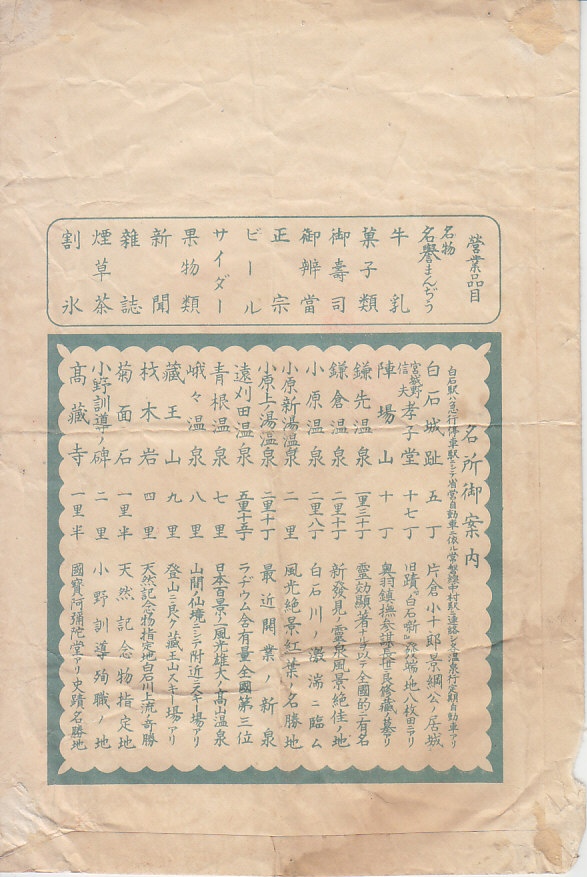 1920年代の、8月5日14時の調製と思われる、昔の白石駅弁の掛紙。名所5か所と温泉案内5か所を列記した、目次のような掛紙。