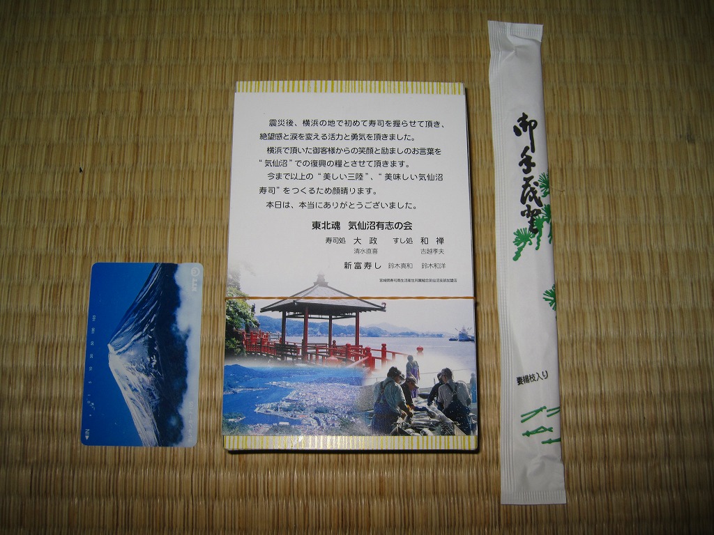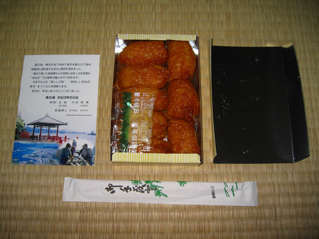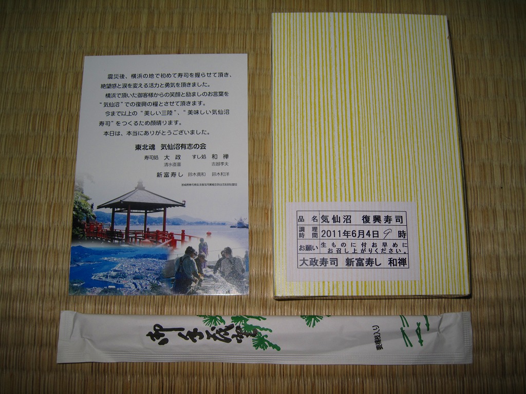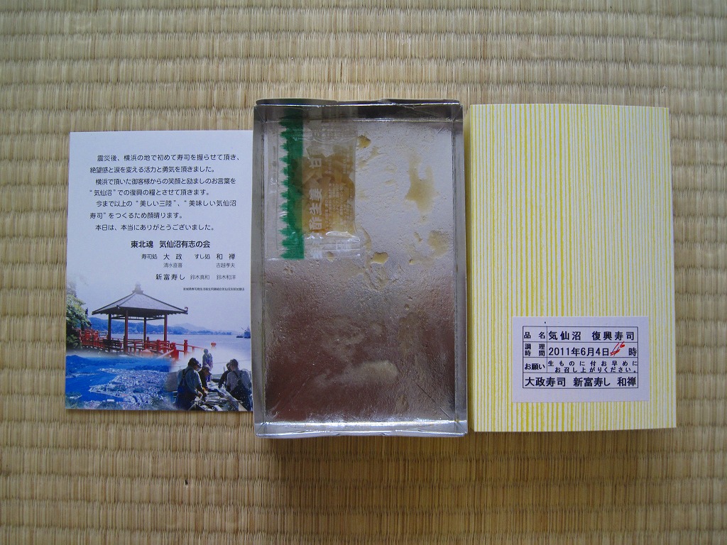 調製元の「大政」「新富」「和禅」は、宮城県気仙沼市内の握り寿司食堂。2011年3月11日の東日本大震災による地震と津波で店舗が全壊、その後はなんと4人で「流され寿司気仙沼握り屋衆」というグループを組み、この横浜市内を皮切りに各地のイベントで寿司を握ったという。