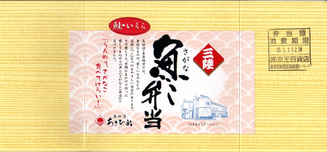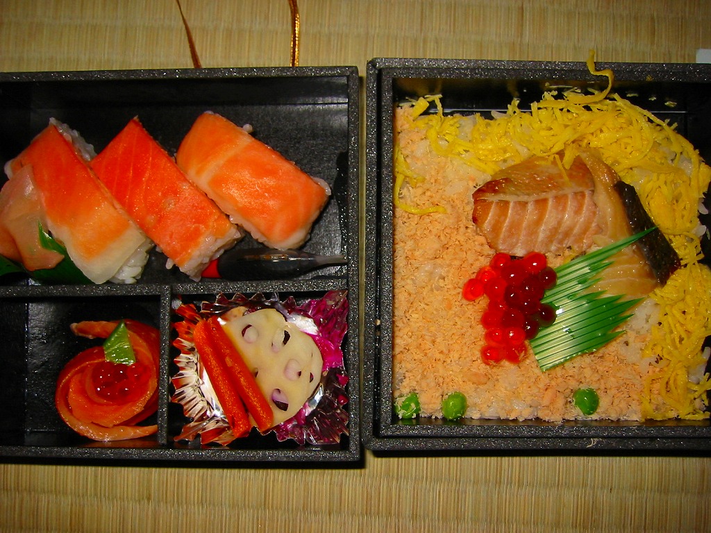 2004(平成16)年1月の京王百貨店の駅弁大会で実演販売。ローカル線の無人駅の駅弁を名乗り、この催事の目玉商品の扱いで、突然に出現した。正方形の容器を二段重ねで使用し、掛紙代わりに木目調のボール紙でふたをして金色のゴムひもでしばる。中身は下段が鮭はらこめし、上段がスモークサーモンの寿司と巻き物など。数名のスタッフで一日何百個も実演販売できるくらいだから、ふた記載の「手間ひまかけて作った」には同意できないが、目でも舌でも、下段に素朴な暖かさ、上段に和風な高級感を感じ取れる、良い内容。