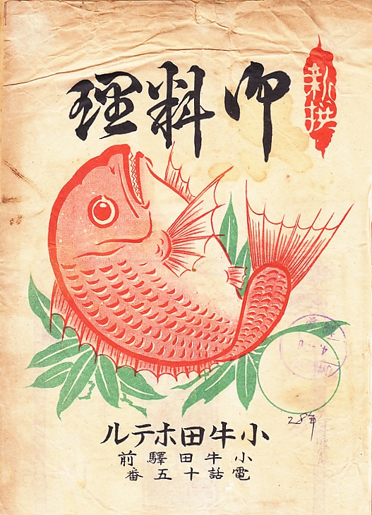 第二次大戦前のものかと思われる、昔の小牛田駅弁の掛紙。収集者は1929(昭和4)年6月28日の調製だとする。小牛田ホテルは小牛田駅の駅弁屋であるが、掛紙に駅弁として必要な記載内容が一切ないため、これは仕出し弁当など駅で売らない弁当の掛紙だろう。タイやエビが華やかな、大きな掛紙。