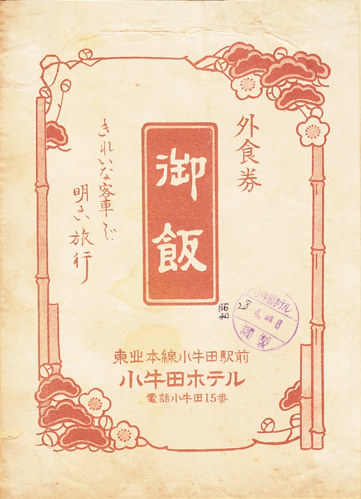 1950年代のものと思われる、昔の小牛田駅弁の掛紙。収集者は1953(昭和28)年4月8日のものと判断し、御飯とおかずの掛紙と箸袋に記したが、調製印は年に加えて月の表記もない、4日6時の調製とも読める。「外食券」の表記があるため、1952(昭和27)年から1955(昭和30)年頃までのものだろう。「新撰御料理」とは、駅弁では聞き慣れない名前だと思う。