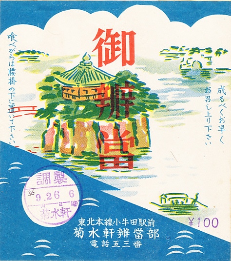 1950年代の7月10日11時の調製と思われる、昔の小牛田駅弁の掛紙。小牛田駅から2kmほどの山の神社と、小牛田からは距離のある東北三景松島を描く。平成時代にも2社が競った小牛田の駅弁は、21世紀に残らなかった。