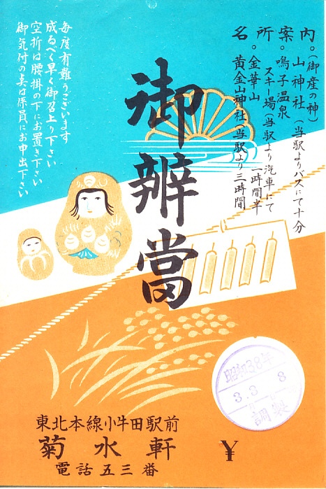 1963(昭和38)年3月3日8時の調製と思われる、昔の小牛田駅弁の掛紙。価格が空欄なのは、ここに100円を入れて並等の幕の内駅弁とするか、150円を入れてごはんの折を別にした上等の幕の内駅弁としたのではないかと推定。稲穂と松川だるまを描いたものか。滝川駅の駅弁と絵柄が似ているのは偶然かどうか。
