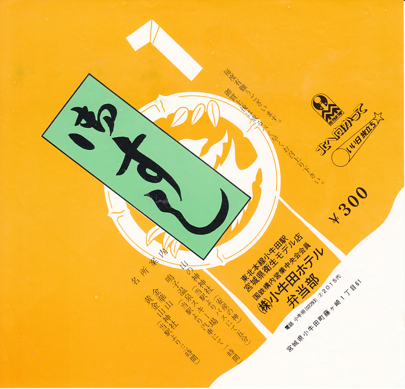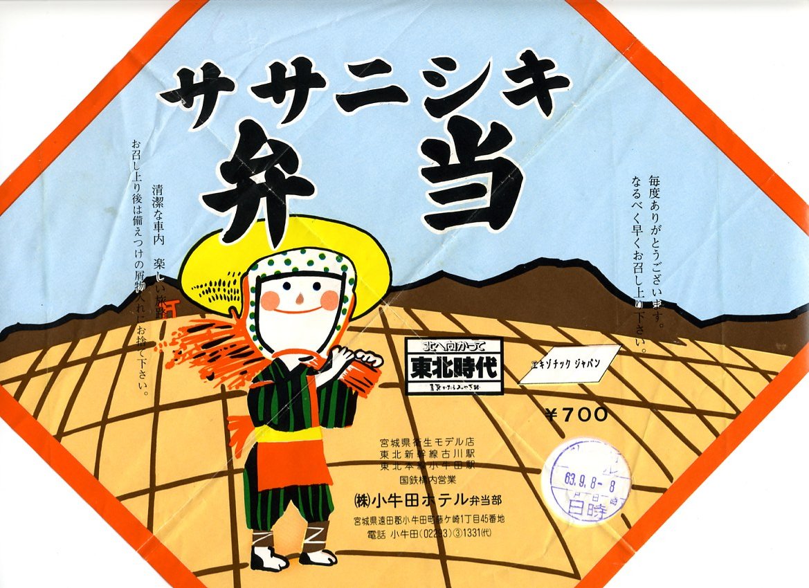 1988(昭和63)年9月8日8時の調製と思われる、昔の小牛田駅弁の掛紙。当時は「ササ・コシ」時代。宮城県古川生まれのササニシキはこの地域でも広く作付され、この駅弁は米どころで米のうまい駅弁として少々の知名度があり、古川駅や小牛田駅を代表する駅弁として駅弁紹介本でよく紹介されていた。ここからは後に駅弁も駅弁屋も消え、ササニシキも1993年の冷害を受けて作付面積を大幅に減らしたが、駅弁屋は今でもこの冷めてもうまい品種を好むところが少なくないという。