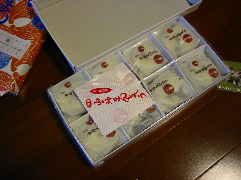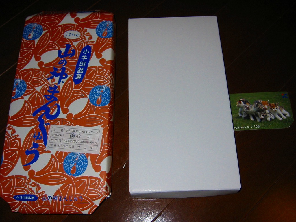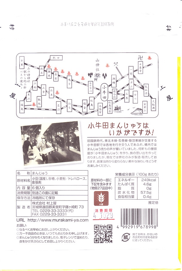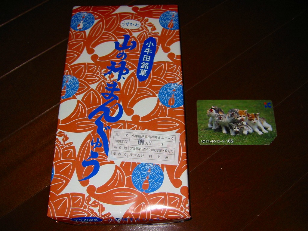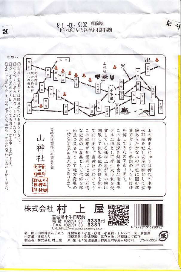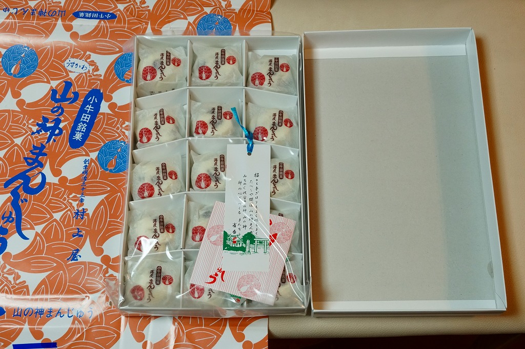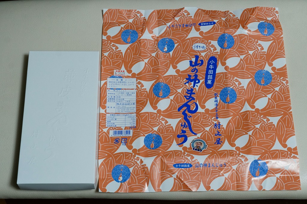 駅売り名物の小牛田饅頭、正式名称「山の神まんじゅう」の、15個入りのもの。包装紙の絵柄や、白いボール紙でできた紙箱のつくりは、8個入りのものと変わらない。観光地ではなく、遠方からの列車が消えたため旅行者が訪れることがなくなった駅で、日持ちがそれほどするわけではない商品がちゃんと個数別に3種類売られていたことで、これが地元で親しまれていることを感じる。8個入りと15個入りは、通信販売でも買える。