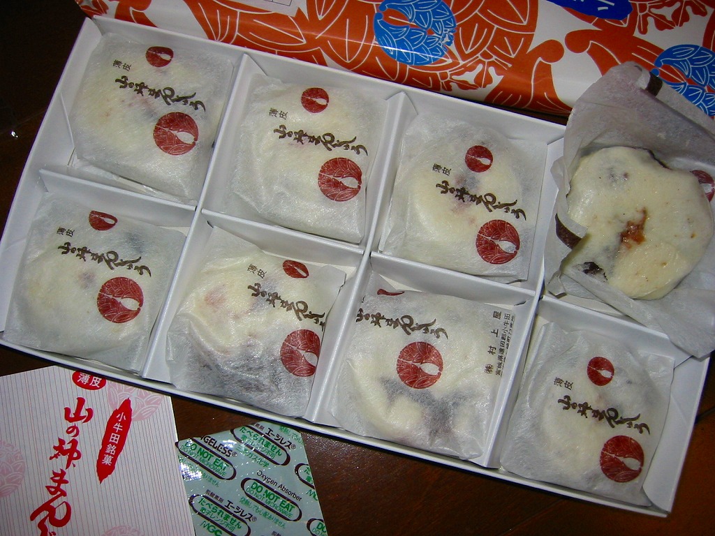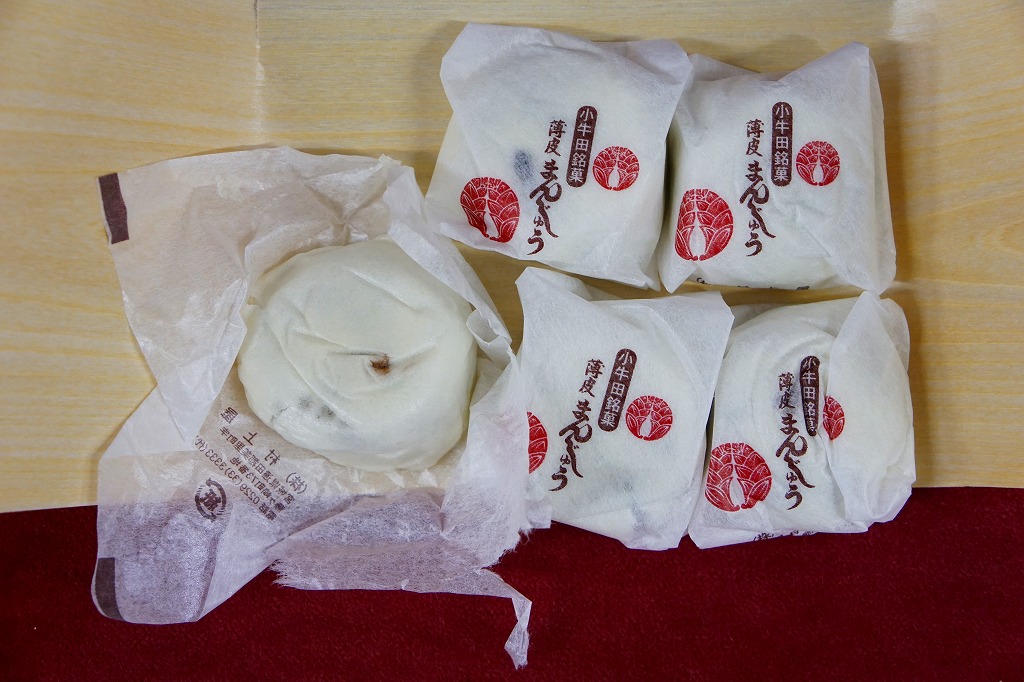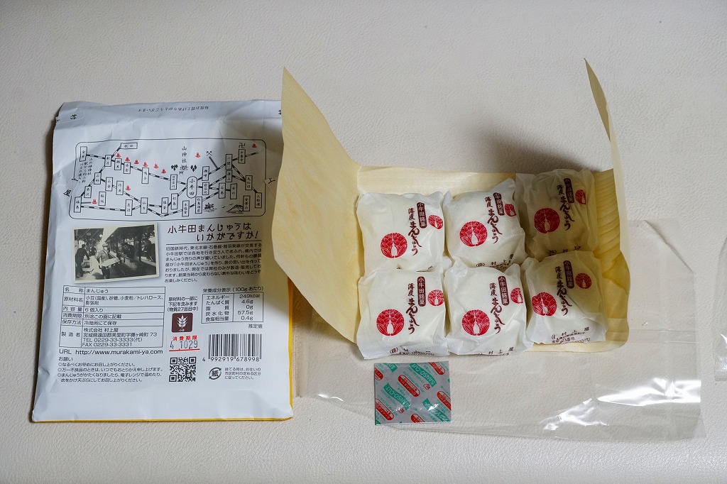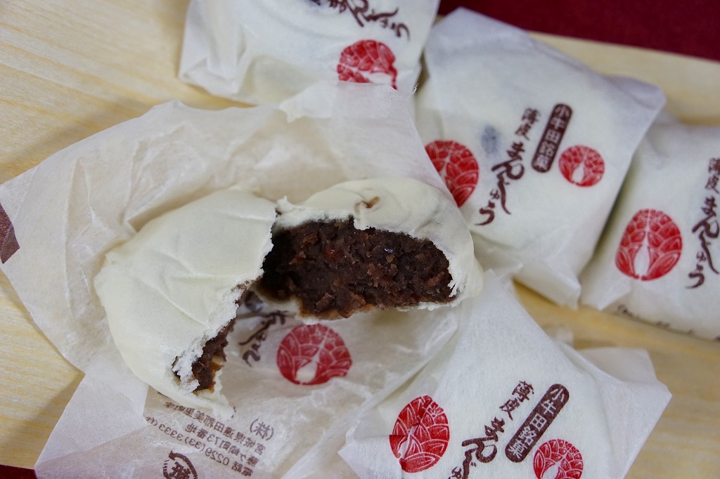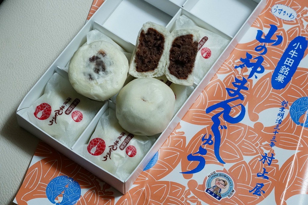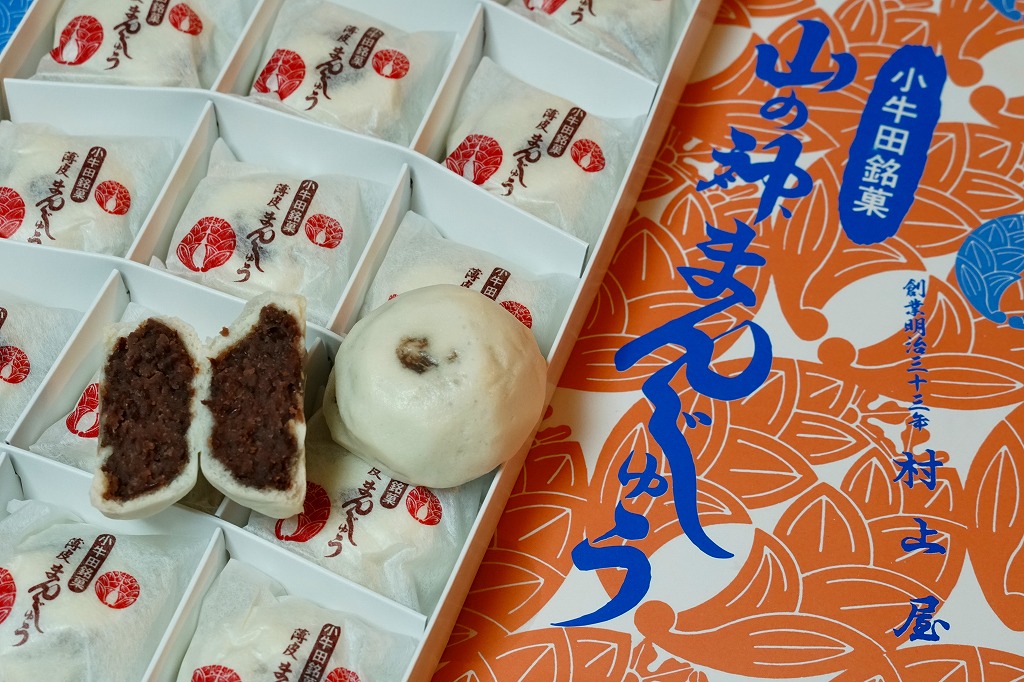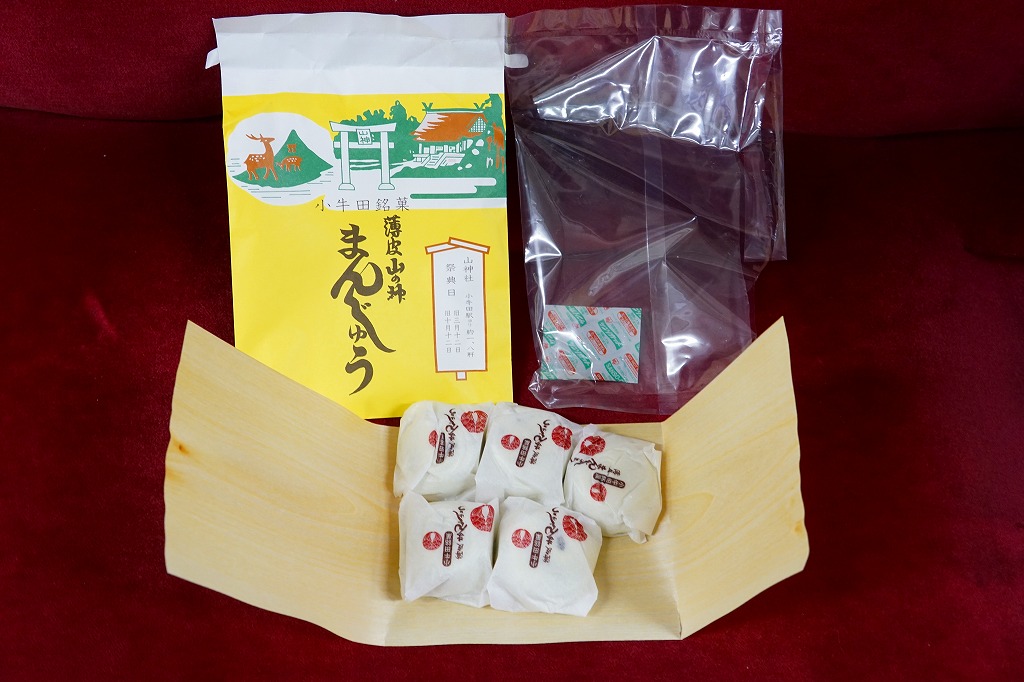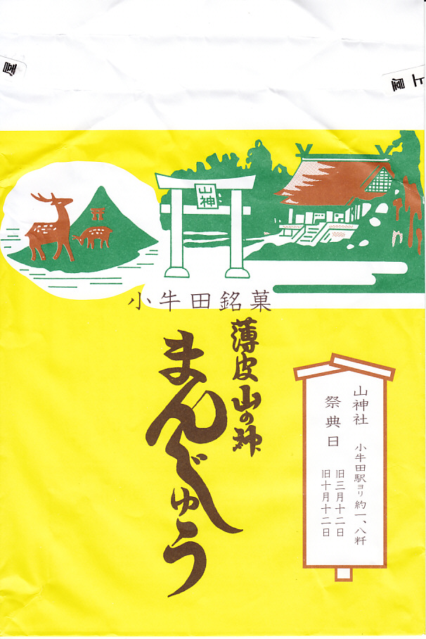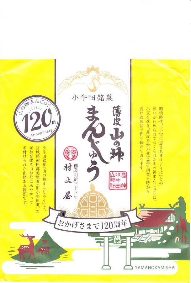明治時代からのルーツを持つという、かつて小牛田駅の駅売り名物であった饅頭で、現代に唯一生き残ったもの。2017(平成29)年までに小牛田駅から売店が消えたため、今は駅では買えないが、旧駅舎の観光案内所や、駅前の調製元や、東北新幹線古川駅のコンビニで買うことができる。パッケージの記載によると、1141年の創建で安産の神様として知られる小牛田の山神社(やまのかみしゃ)の、門前町の名物饅頭が鉄道駅に進出したものだそうな。