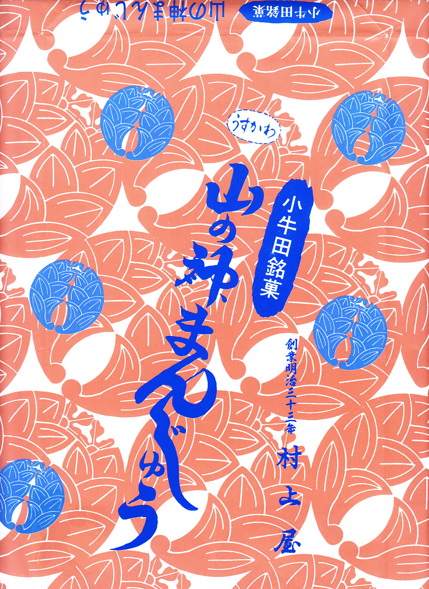 昭和30年代、1960年前後のものと思われる、昔の小牛田まんじゅうの紙袋。表側に神社と商品名を描いて山神社の祭典日を記し、裏面に路線図と説明文を記す構成は、現在の村上屋のものと変わらない。当時は複数の調製元が、小牛田まんじゅう、山の神まんじゅうを販売していたという。