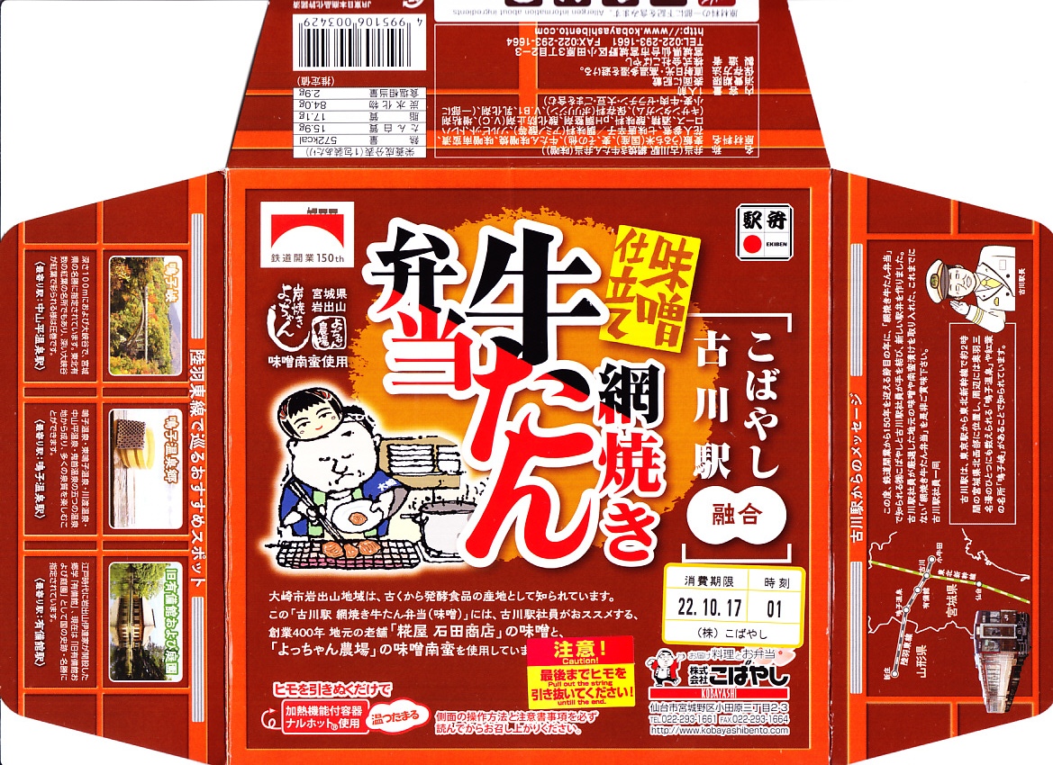 基本的には、仙台駅で人気の駅弁「網焼き牛たん弁当」と同じ。調製元も同じ。商品名などを賑やかに記した紙箱に収めた、丸い加熱機能付き容器に、麦混じりの白飯を詰め、牛たんの味噌焼きを貼り、花人参を据え、味噌南蛮漬を添える。味も仙台駅弁。古川駅がある宮城県大崎市の味噌と味噌南蛮を使ったそうな。2023年で終売か。