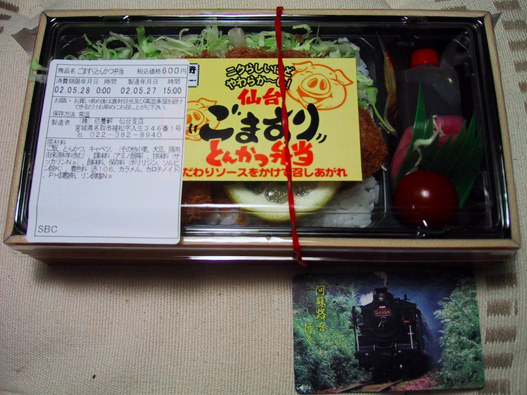 容器に透明なふたをかけた簡素な容器で、掛紙はなくシール貼り。白御飯の上に千切りキャベツとトンカツを載せて、スライスレモンとパセリにミニトマトが入る、内容は一般的なトンカツ弁当そのもの。味は美味い宮城米にやわらかいトンカツと、仙台駅弁は期待を裏切らない。現存しないものと思われる。