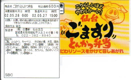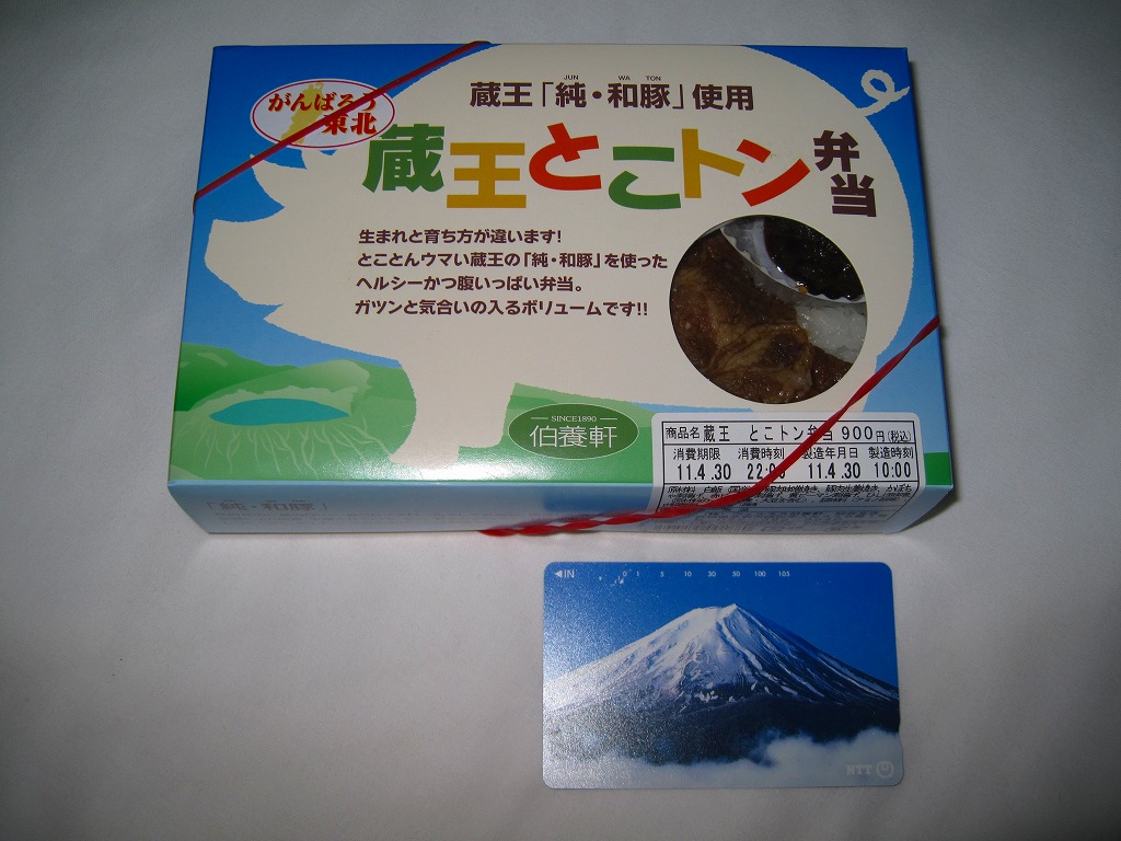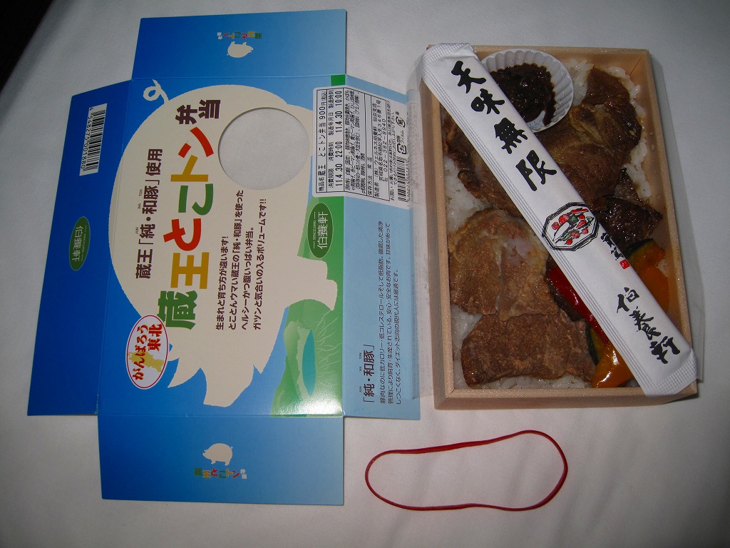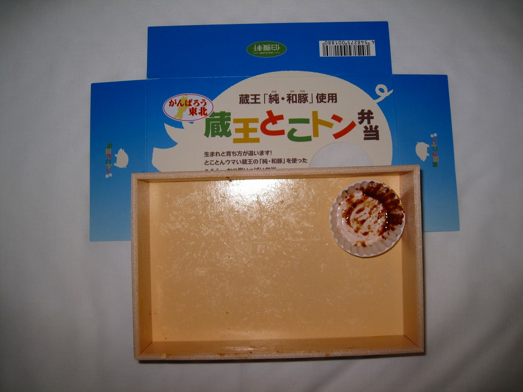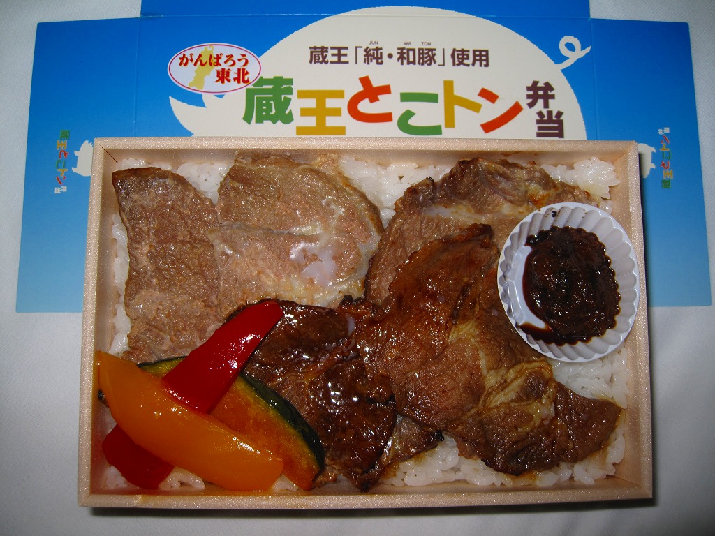 2008(平成20)年に発売か。小柄な長方形の容器に透明なふたをして、豚と蔵王と宣伝文をデザインしたボール紙のふたをする。中身は白御飯の上に豚肉の味噌焼と生姜焼を貼り付け、カボチャと2色のピーマンを付け、ひしほ味噌を添えるもの。見た目に脂が浮いて少し臭う豚肉も、御飯と合わせて食べれば、しっとりしていていい感じ。「純・和豚(じゅん・わとん)」とは、宮城県刈田郡蔵王町の丸山グループが生産し主に仙台へ出荷される銘柄豚で、低カロリー・低コレステロール・高タンパク質を実現したヘルシーな豚肉なのだそうな。2011年までの販売か。