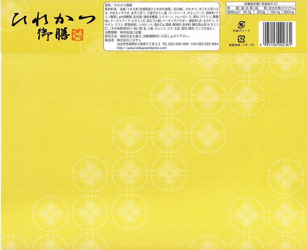 2015(平成27)年に限り販売か。商品名のとおりのヒレカツ弁当で、刻み梅をまぶした白御飯、5切れにカットされたひれかつ、ほうれん草パスタ、かぼちゃサラダ、きんぴらごぼう、小茄子からし漬。特徴がないのが心地良い、駅弁らしさのないところが機能的な、常温で普通に上質なトンカツ弁当だった。