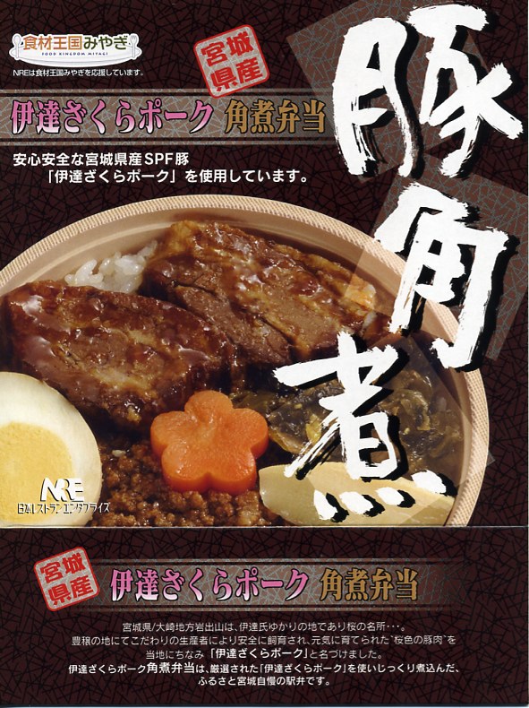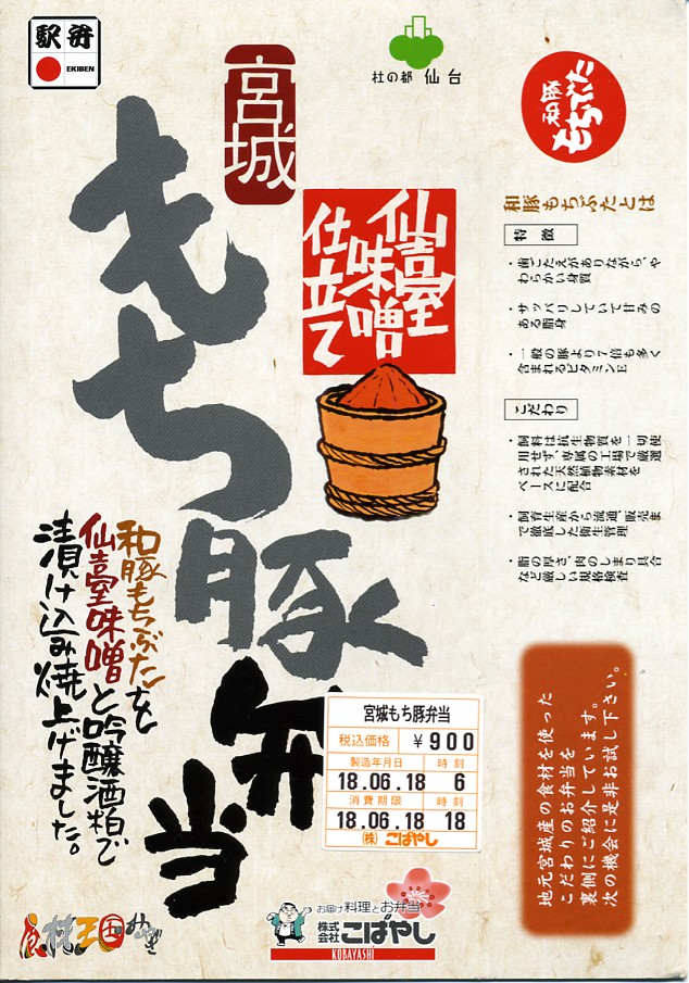 2006(平成18)年3月19日に発売。黒い長方形の容器に同色同素材のふたをしてゴムで留め、商品名と売り文句などを書いたホールが身の枠にはめる。中身は白御飯の上にささがきごぼうを敷いて、仙台味噌と吟醸酒粕で漬けて焼いた宮城県産「和豚もち豚」をベタベタと貼り、ニンジンと絹さやと舞茸を添え、うぐいす豆と長なす漬と紅大根甘酢漬を付ける。