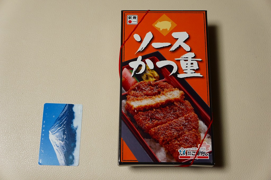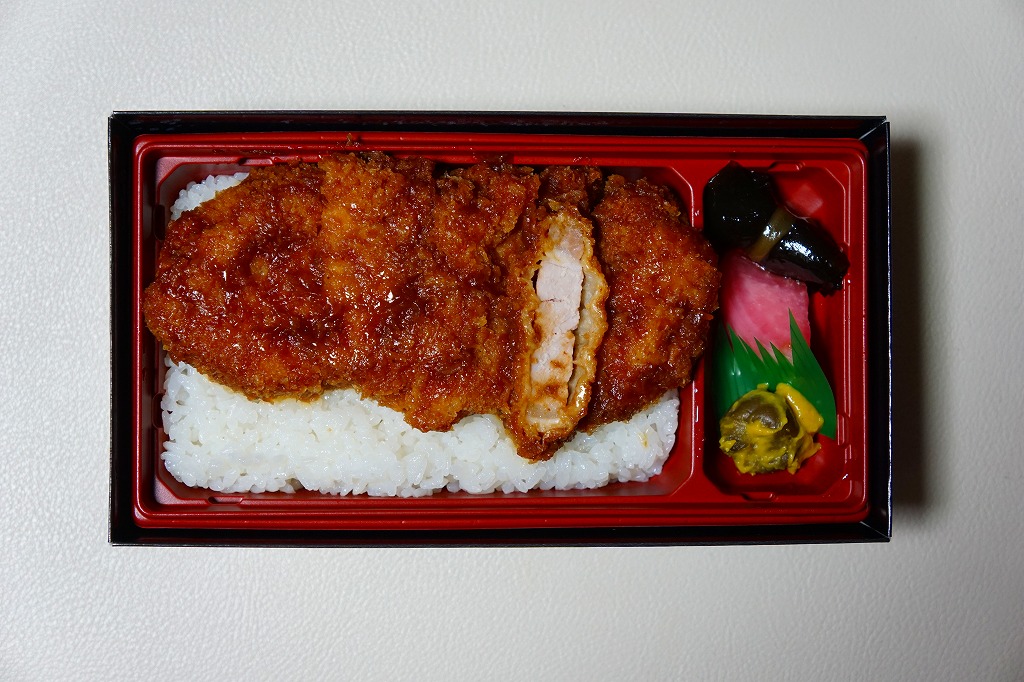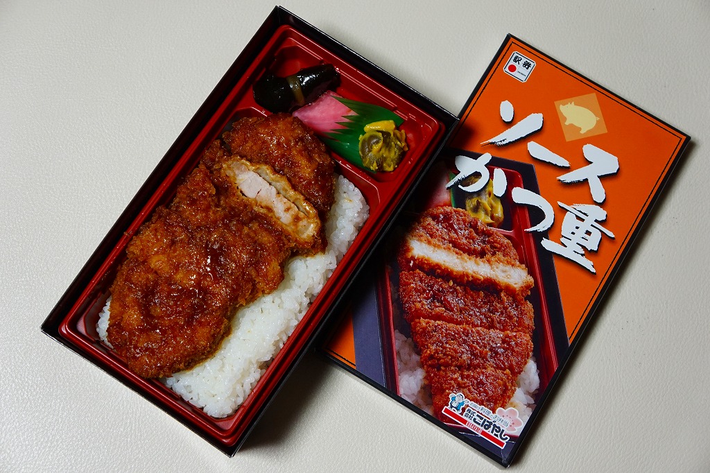 2014(平成26)年の発売。10年ほど前に同じ名前と中身で同じ調製元が同じ駅で売っていた駅弁の再登場。中身はふたの写真のとおり、白御飯の上にソース漬けのトンカツを5切れに刻んで1枚置き、ニシン昆布巻、紅大根、ナスからし漬を添えるもの。メインのカツは衣が厚めで肉が薄めも、辛さや臭みがなく、食べやすいという意味で印象に残りにくいカツ丼。とても実用的な駅弁。2018年までの販売か。