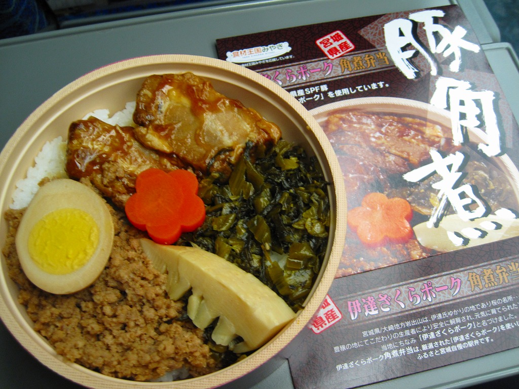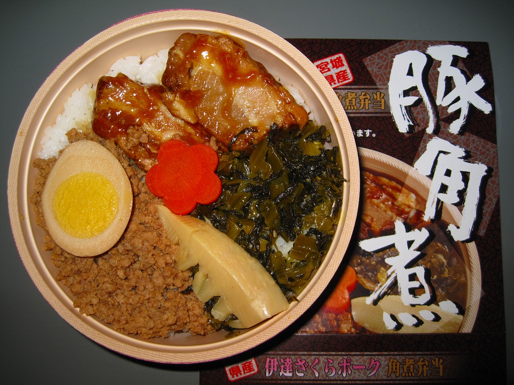 角煮弁当を名乗るのに角煮が2個しか入っていないという感想はあるが、冷めてもうまく、見た目どおりの味で、分量もほどほどで、価格も控えめという、地味だけどハズレのない安心感のある駅弁。伊達ざくらポークについてはパッケージに宣伝文が書かれるが、実際には宮城県産のSPF(Specific Pathogen Free)豚(=特定の5つの疾患を持たない豚)のうち、宮城県大崎市古川の古川ミートの商品である模様。
