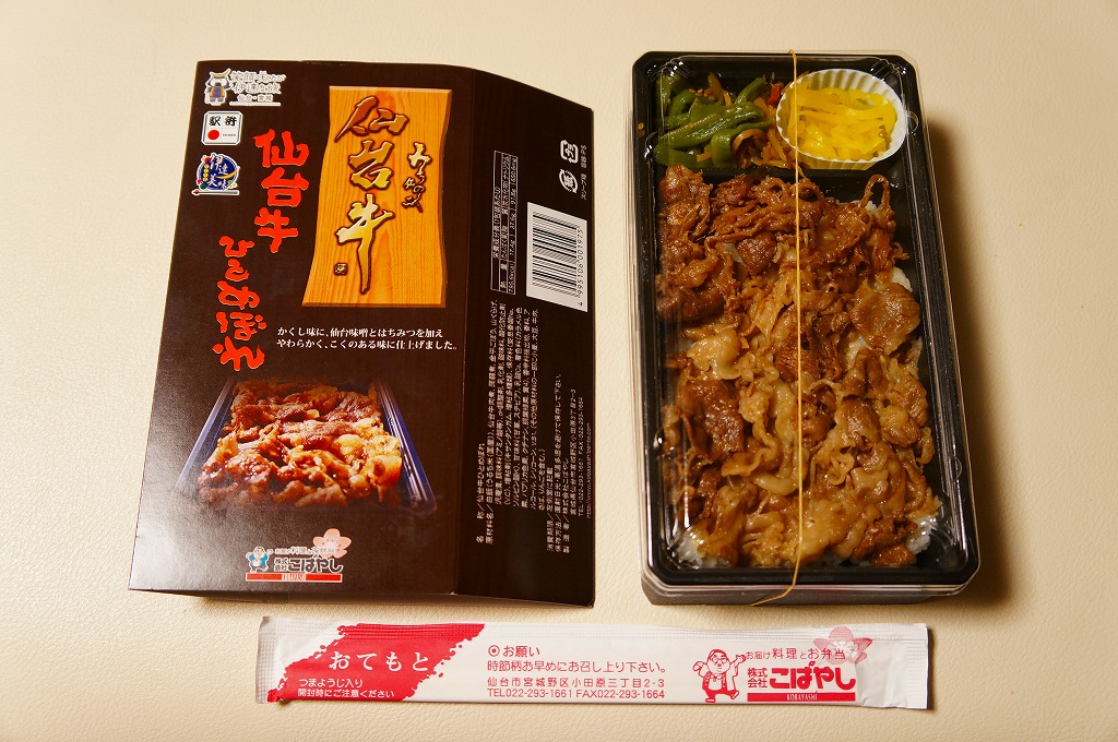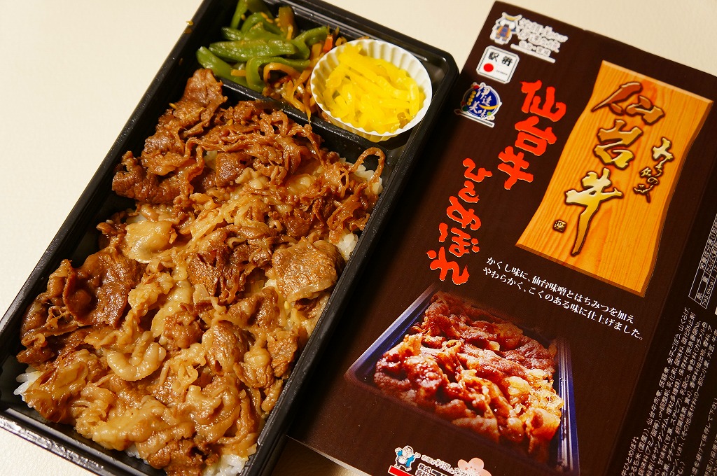 仙台箪笥(たんす)をイメージしたという、しかし頑丈ではない長方形のボール紙容器を使用、中身は御飯の上に宮城県産日高見牛甘辛煮が、ネギやゴボウやコンニャクや人参とともに載り、玉子焼きとナス漬とタクアンが添えられる。地域色を感じ取り難い名前や内容に、そこそこ美味い牛肉にそこそこ素っ気ないパッケージで、全体的に期待を上回らないし、下回らない。現存しない模様。