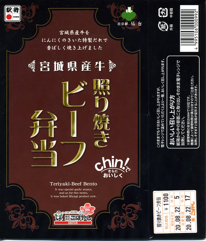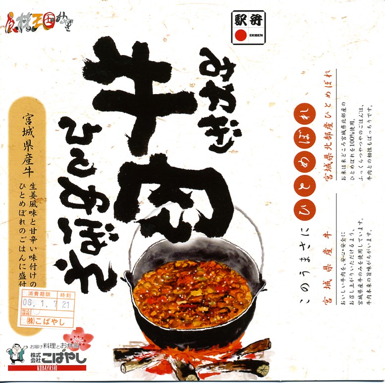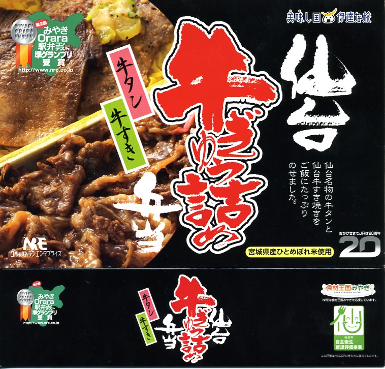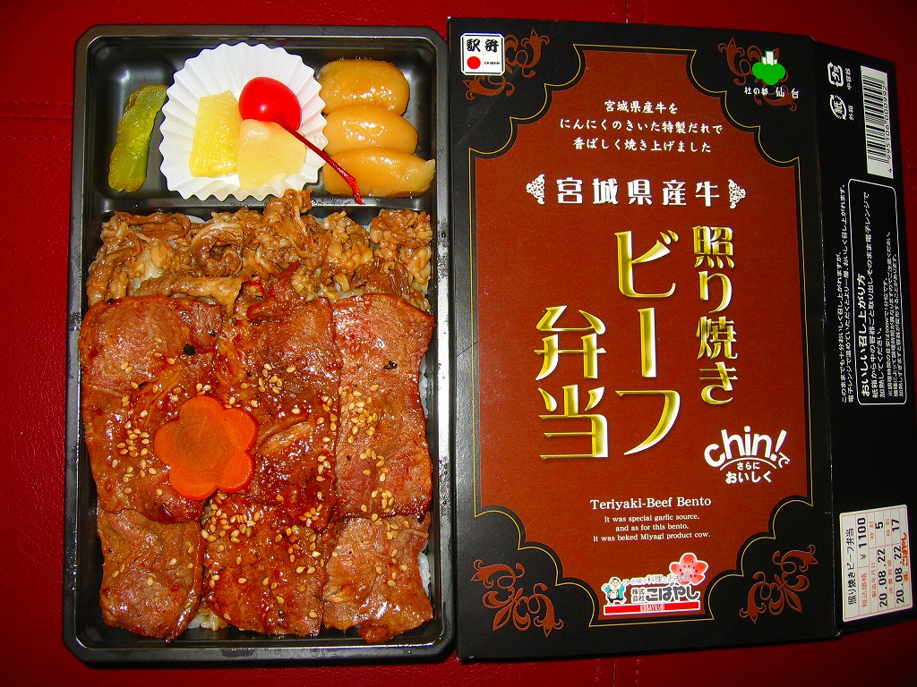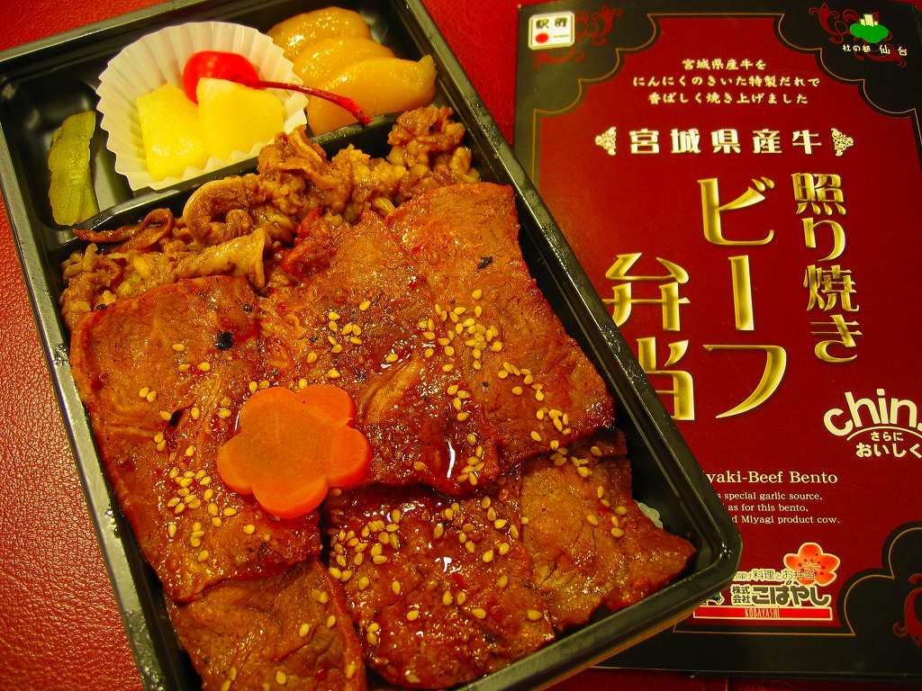2008(平成20)年に発売か。黒いトレーを収める黒い紙箱を輪ゴムで留める。中身は宮城米ひとめぼれの白御飯の上を宮城県産牛のニンニク風味な照焼としぐれ煮で覆い、パイナップルとさくらんぼとピクルスと煮豆を添えるもの。お肉たっぷりの牛肉弁当で、風味や食感はなぜかなんとなく仙台の牛たん駅弁。この商品は首都圏へ積極的に輸送されており、パッケージにはレンジでの加熱を勧める記述もある。価格は2008年の購入時で1,100円、2010年時点で1,000円、2014年時点で1,050円。2014年頃までの販売か。