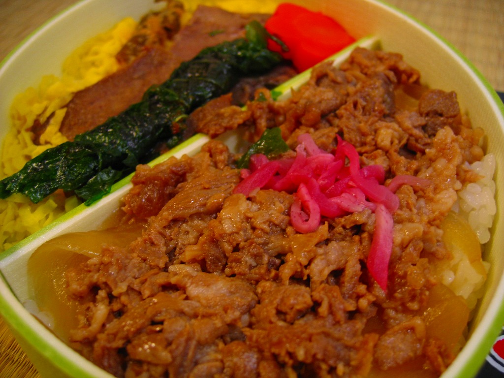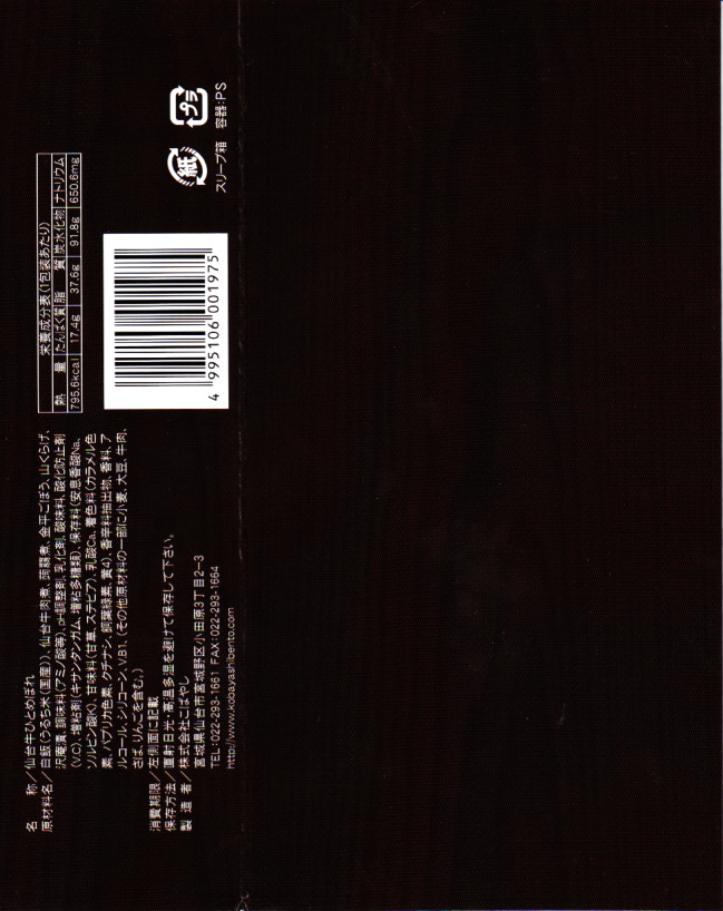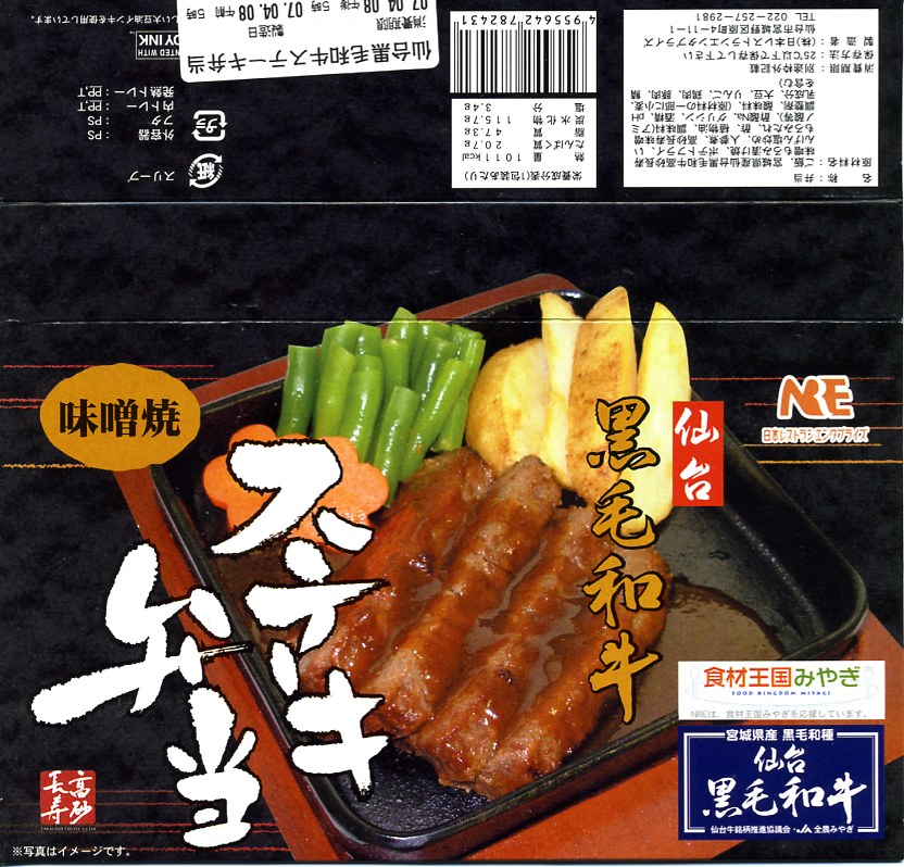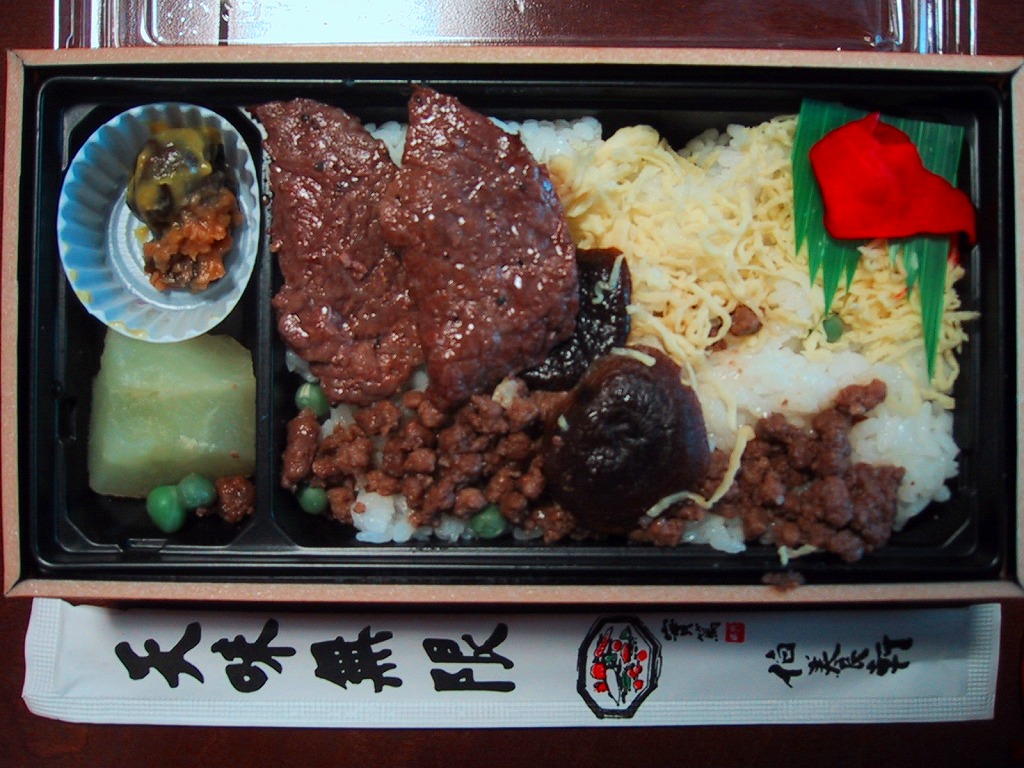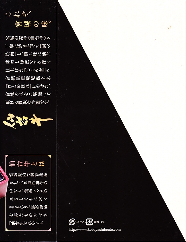 2008(平成20)年に発売か。黒いトレーを収める黒い紙箱を輪ゴムで留める。中身は宮城米ひとめぼれの白御飯の上を宮城県産牛のニンニク風味な照焼としぐれ煮で覆い、パイナップルとさくらんぼとピクルスと煮豆を添えるもの。お肉たっぷりの牛肉弁当で、風味や食感はなぜかなんとなく仙台の牛たん駅弁。この商品は首都圏へ積極的に輸送されており、パッケージにはレンジでの加熱を勧める記述もある。価格は2008年の購入時で1,100円、2010年時点で1,000円、2014年時点で1,050円。2014年頃までの販売か。