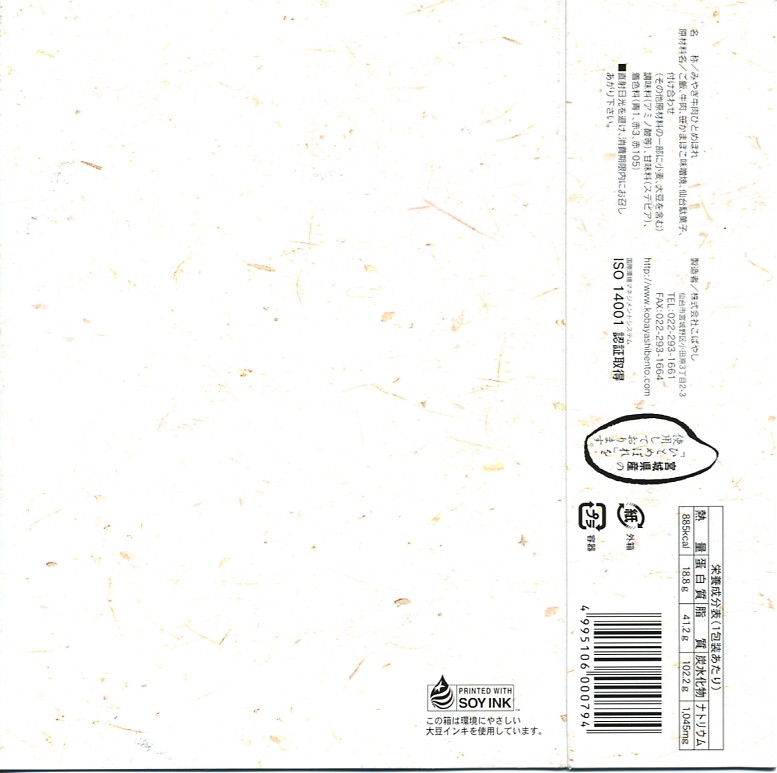 2005(平成17)年に発売か。米粒型の容器を、弁当名と鍋を描いたボール紙の枠にはめる。中身は宮城米ひとめぼれの白御飯の上に、宮城県産牛のすき焼き肉とそぼろ肉を敷いて、笹蒲鉾や仙台駄菓子などを添えるもの。