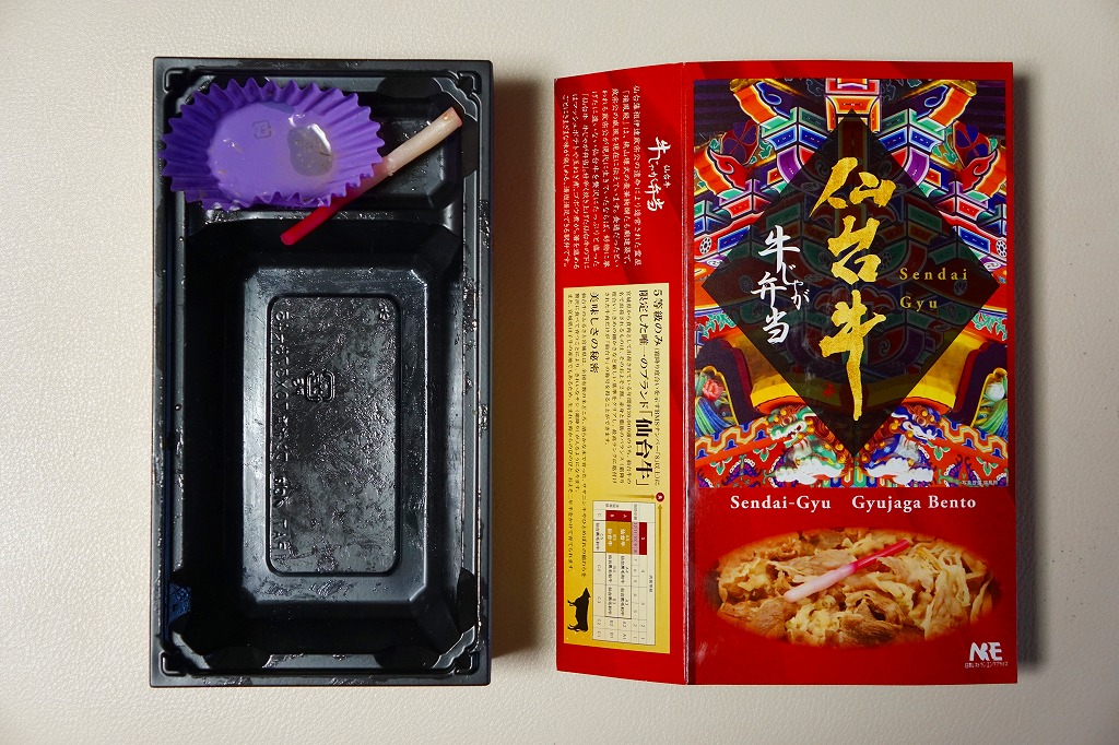 2021(令和3)年4月に仙台駅で発売か。中身はスリーブの写真のとおり、長方形のプラ容器に白飯を敷き、仙台牛の炭火焼肉と、仙台牛しぐれ煮で半分ずつ覆い、バランとはじかみで彩り、ステーキソースと山くらげと紅大根を添える。黒毛和種、宮城県内肥育、市場等に出品、規格A5またはB5と定義される仙台牛とそれ以外のブランド牛を食べて区別することは無理でも、中身に仙台を感じなくても、これはおいしい牛肉駅弁。2023年5月限りで終売。