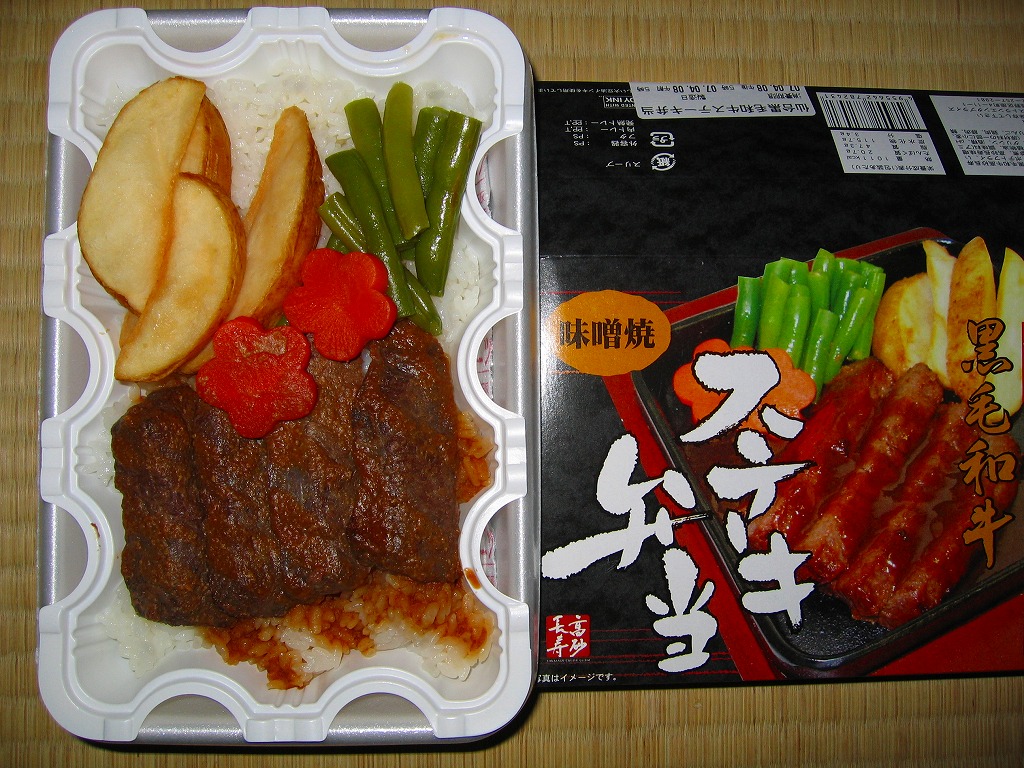 2006(平成18)年7月1日に発売。長方形の加熱機能付き容器を、中身の写真が大きな紙枠にはめる。中身はその写真と比べて具の分量を3分の2ほどにした、牛ステーキ味噌焼4切れとフライドポテトにインゲンと花ニンジンが、白御飯の上に載るもの。