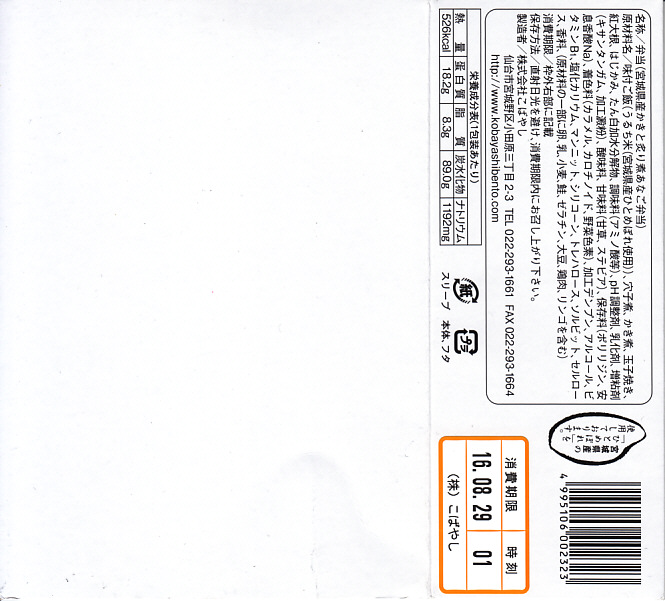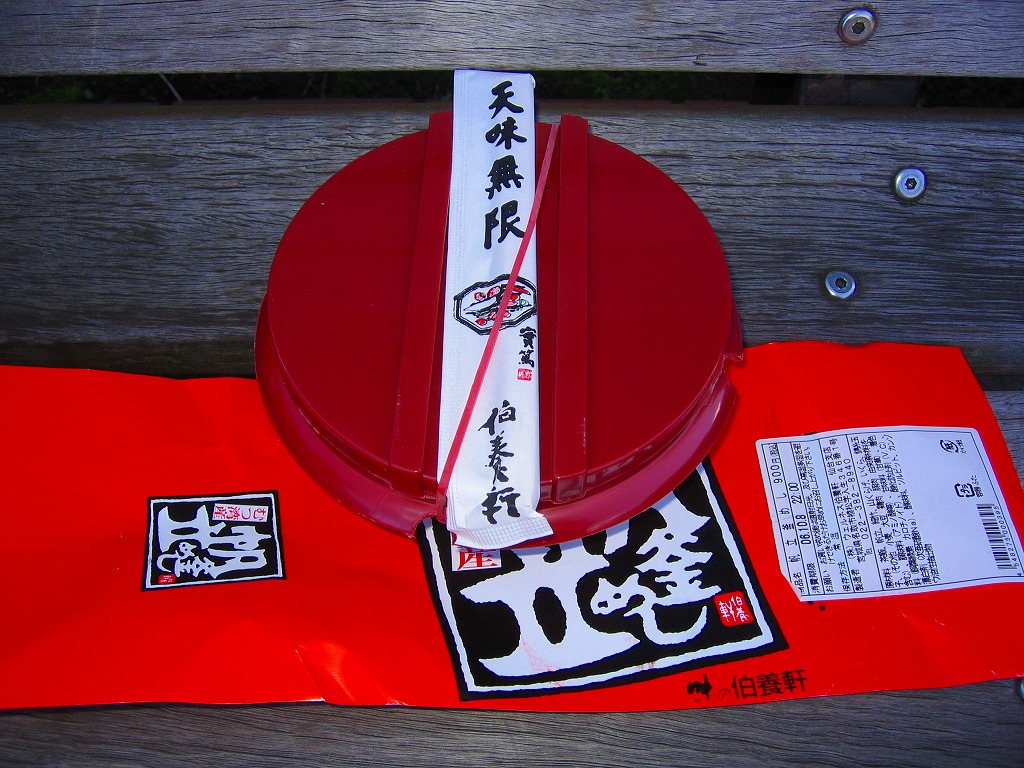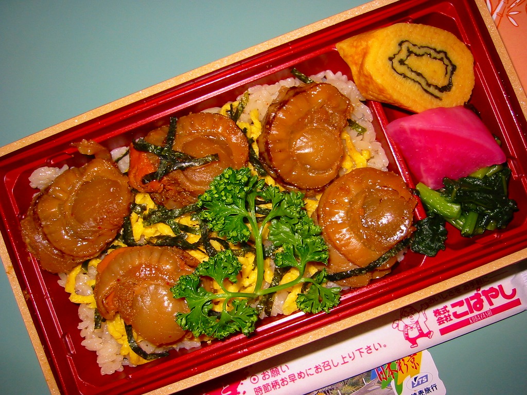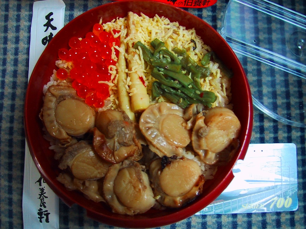 発泡材枠にトレーを接着した容器をボール紙の枠にはめる、JR東日本エリアでよく見掛けるゴミ減量型容器。御飯の上に厚みのある、程良い甘辛さの煮帆立を5個載せている。この内容の駅弁が700円とはさすが仙台で、モリモリ食べられるファストフード系駅弁。2007年頃までの販売か。