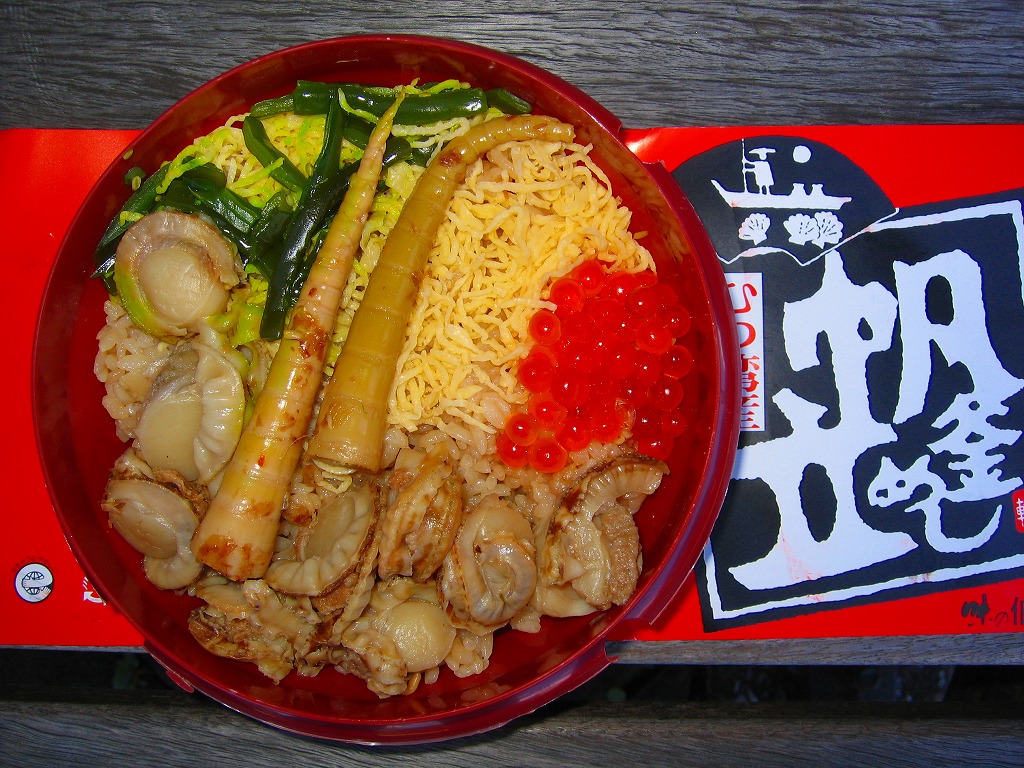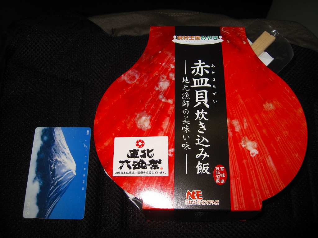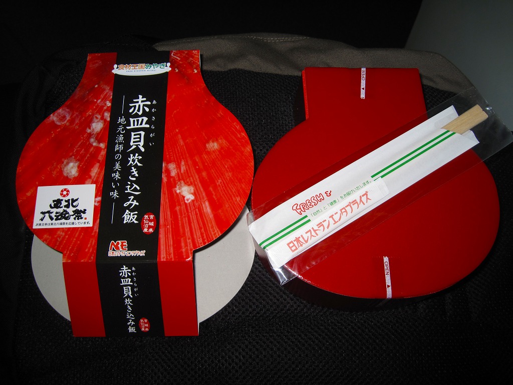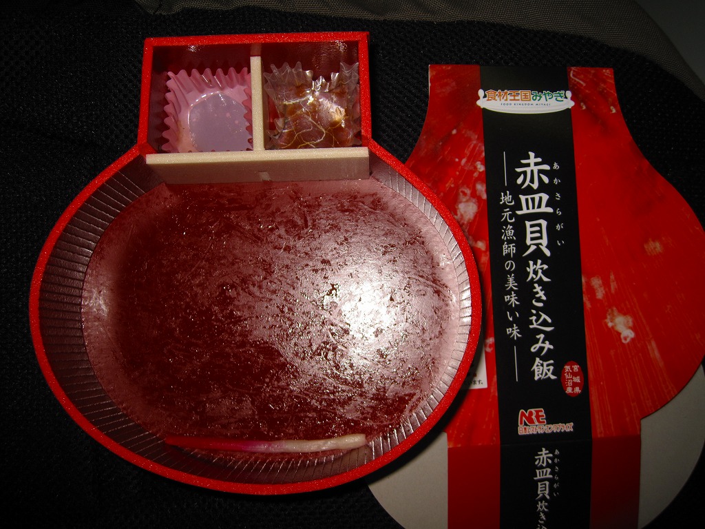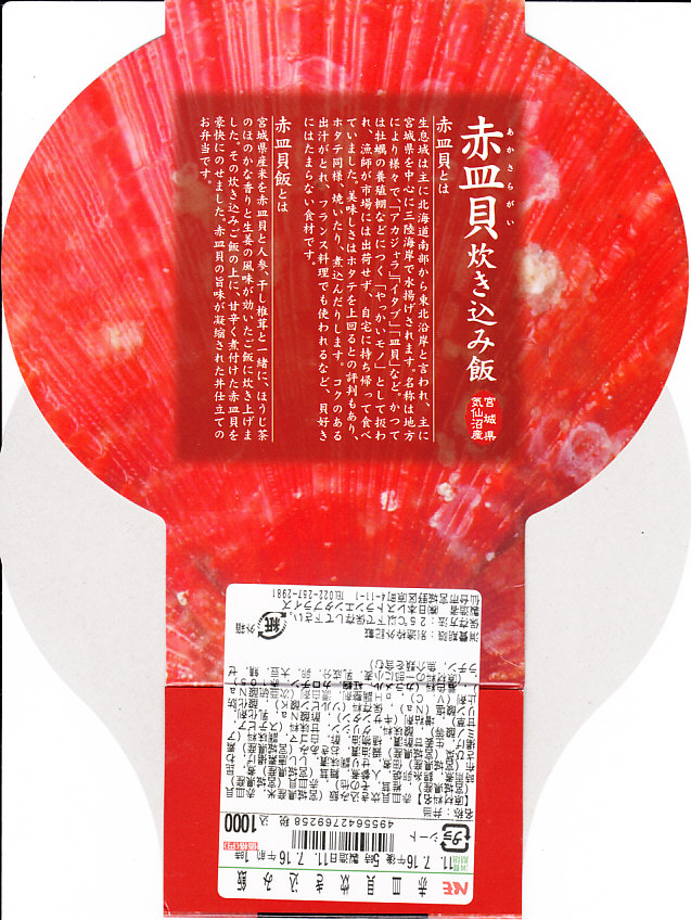 2011(平成23)年6月3日から、仙台駅で6000個限定で販売。アカザラガイ型というかホタテ型の赤い発泡材製容器を、貝殻の柄を持つ同じ形のボール紙の枠にはめる。中身はアカザラガイを炊き込んだ五目飯にアカザラガイのしぐれ煮を載せ、ニンジンやししとうや錦糸卵などで彩り、昆布佃煮とセリ調味漬を添えるもの。味こそホタテのB〜C級品という印象だが、これも面白い味。赤い容器の形状や中身の見栄えも良い感じ。