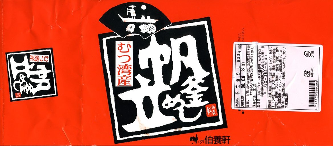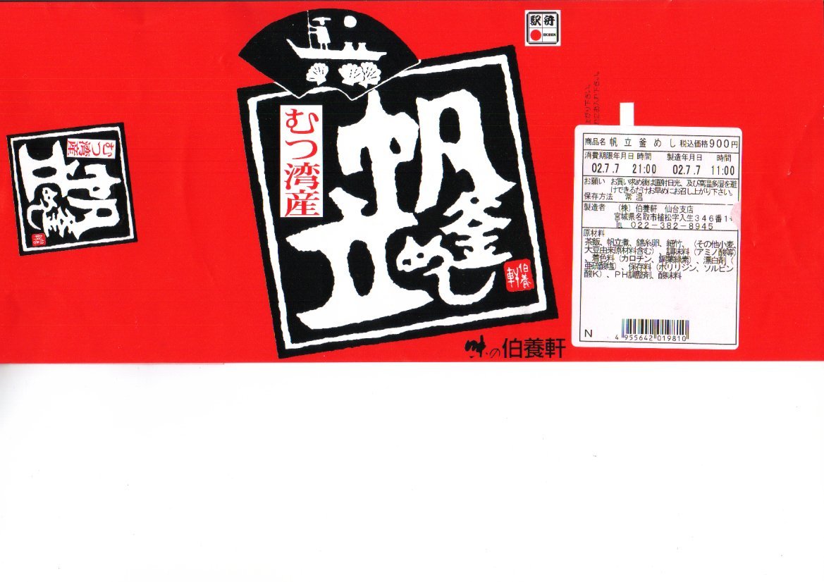 2002(平成14)年7月7日に購入した、仙台駅弁の掛紙。掛紙そのものは当時の伯養軒の、仙台、盛岡、青森の各地区で共有したものと思われる。絵柄は上記の2006年のものと変わらないが、この時は掛紙に駅弁マークが付いていた。伯養軒が清算されウェルネス伯養軒となり、日本鉄道構内営業中央会から抜けたため、駅弁マークが使えなくなった。
