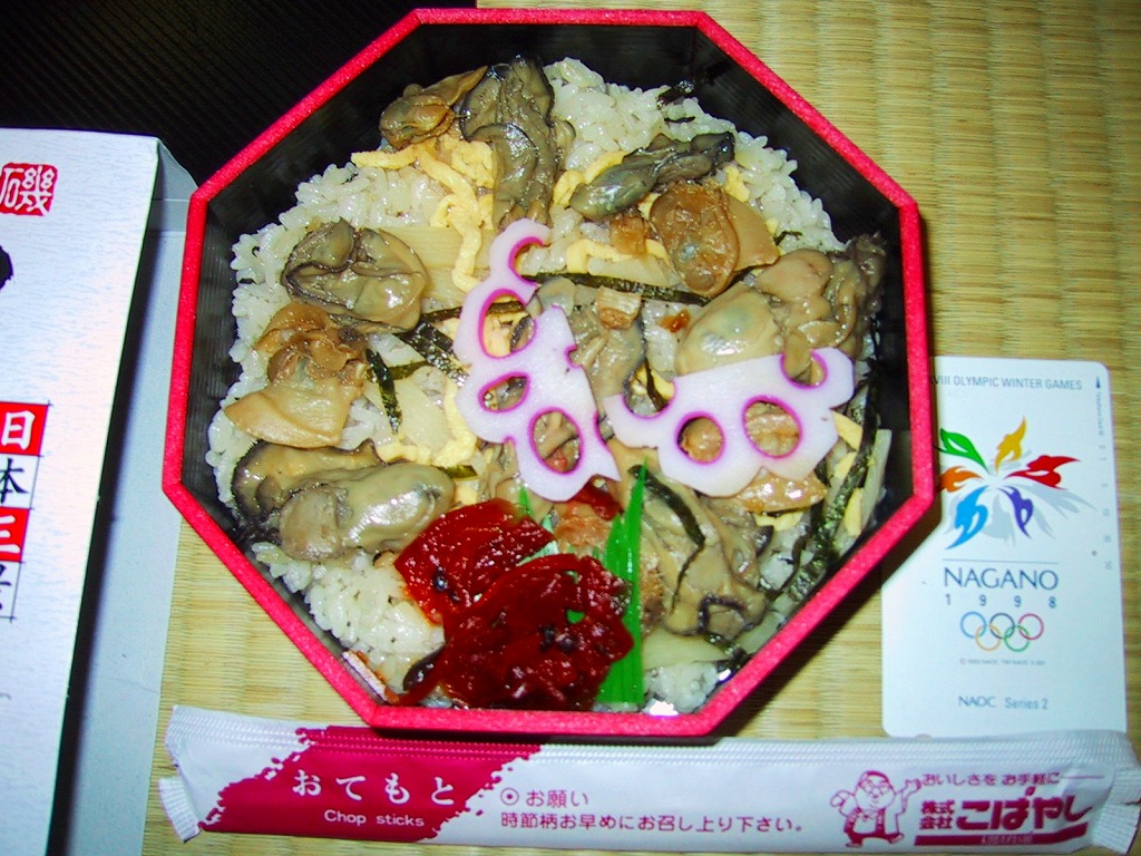 正方形のボール紙製パッケージに正八角形の容器を入れる。中身はひじき御飯の上にハマグリやタケノコに錦糸卵や刻み海苔など、そしてカキが無造作に載せられている。御飯が上から見えているので写真映りが悪いが、福神漬けの臭いがカキ他の食材に染み付いてなければ、かなり良い味が出ていたのではと思う。現存しない模様。