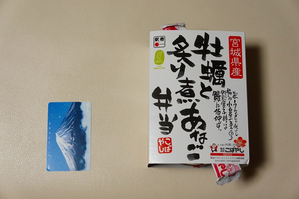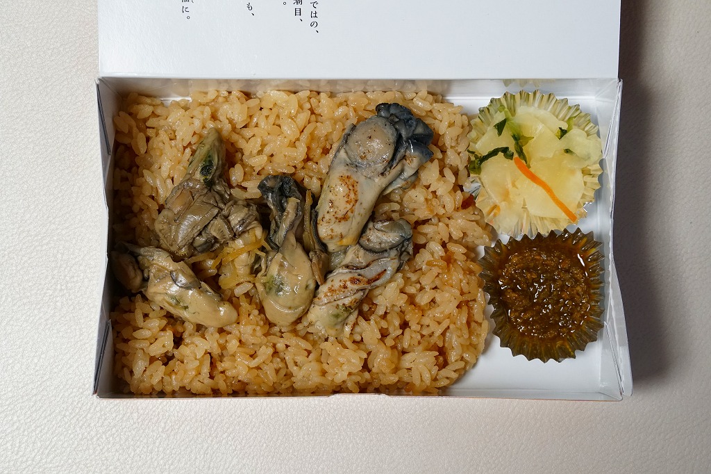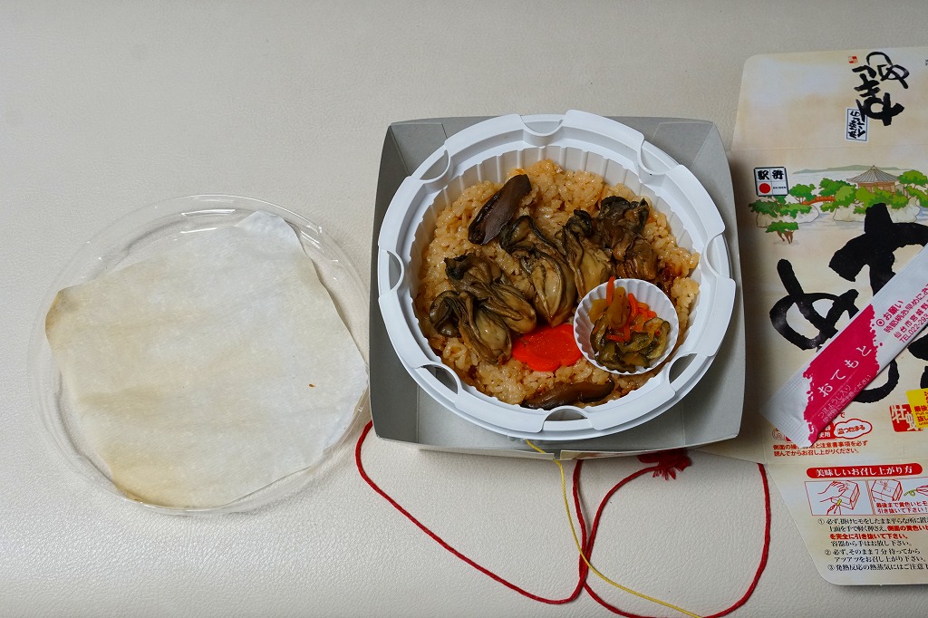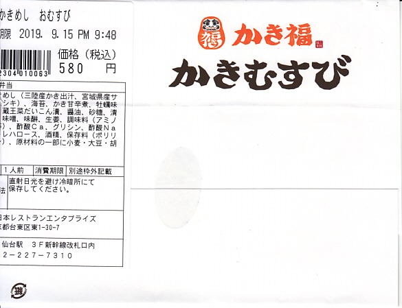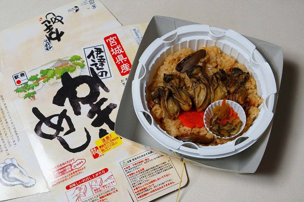 2015(平成27)年3月頃の発売か。楕円形の容器に宮城米ひとめぼれの味付飯を詰め、いずれも宮城県産というカキ煮とアナゴ煮で覆い、はじかみ、厚焼玉子、紅大根を添える、シンプルな駅弁。カキの粒もアナゴの刻み方もやや大きめで、常温で飯に合う適度な柔らかさと香りと味付けを持っていたと思う。パッケージの記述も含め、余計なものがないので、ストレートに味と腹を楽しめる駅弁。2019年までの販売か。