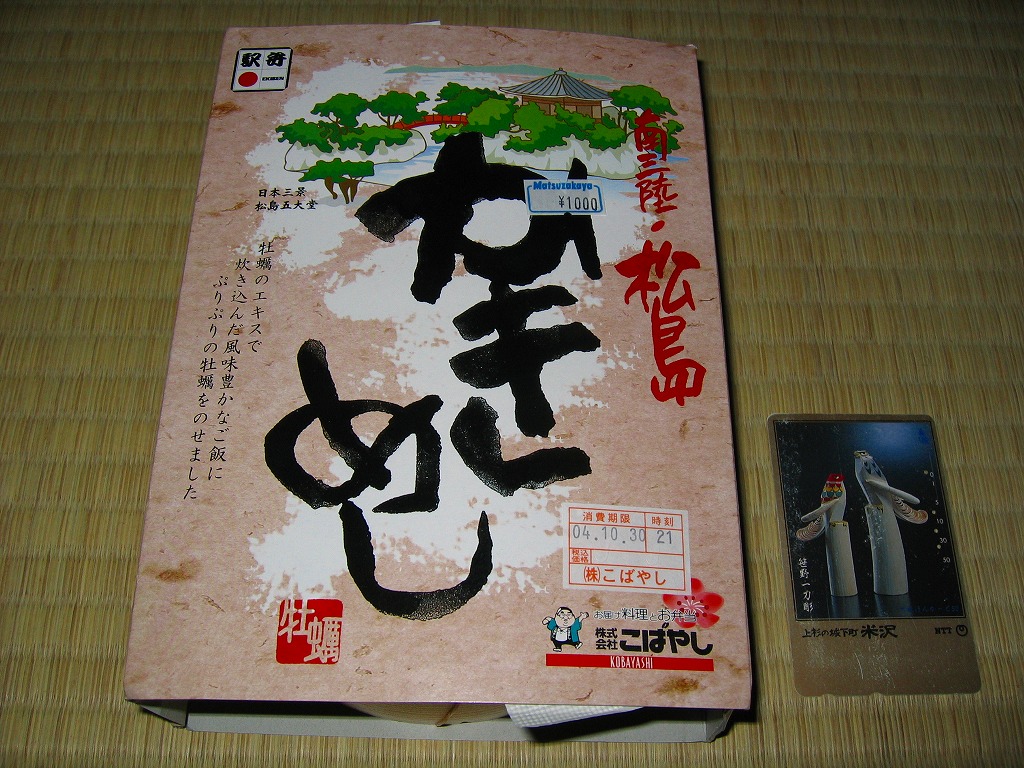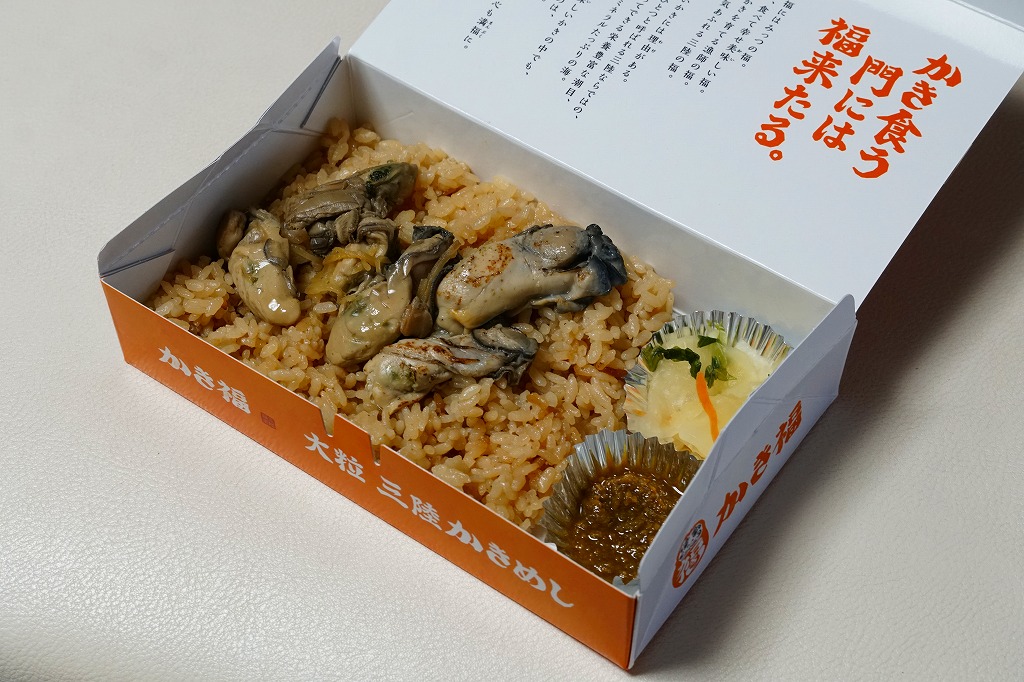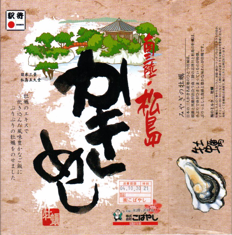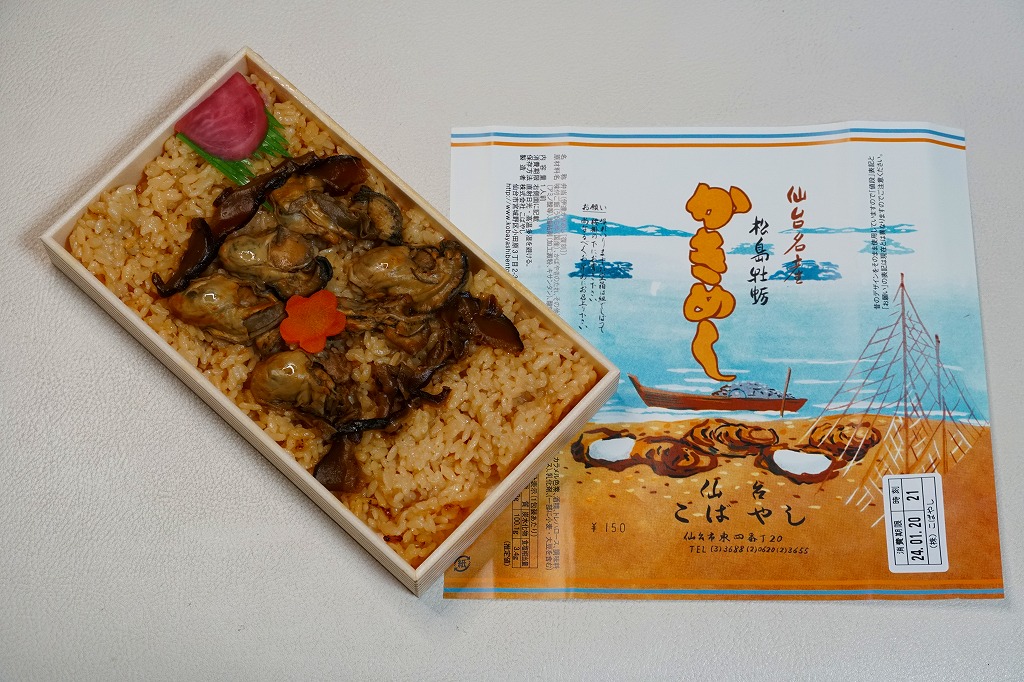 2004(平成16)年10月5日に発売。おそらく下記の駅弁「磯かきめし」をリニューアルしたものと思われる。前年の夏に販売された駅弁「とことん宮城弁当」で使った米粒型の容器を、松島五大堂を簡単に描いたボール紙の枠にはめる。中身はカキのエキスで炊いた宮城県産ひとめぼれの御飯に、青のりと錦糸卵と福神漬、そして風味も食感も豊かなカキを8個ほど載せて、シメジや笹蒲鉾を添える。