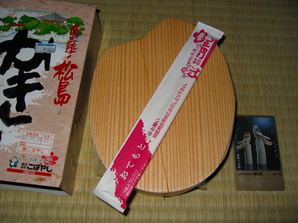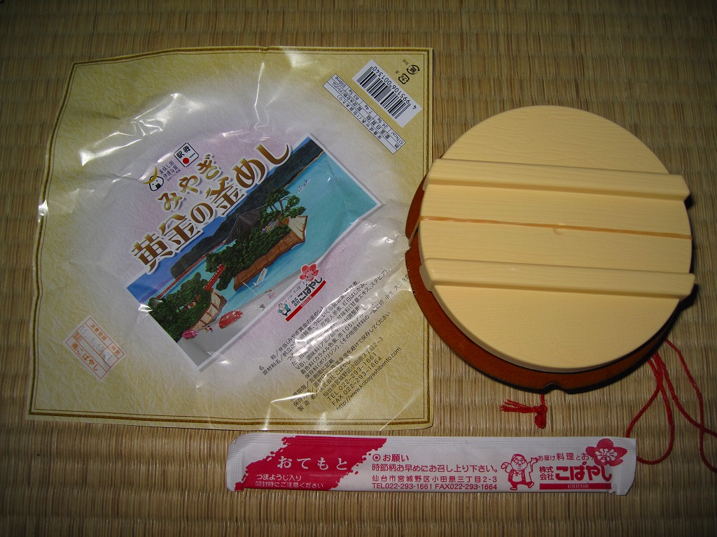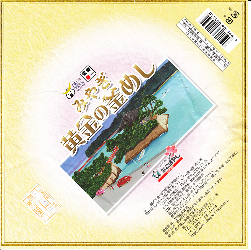 2010(平成22)年秋の新作として、2010年10月9日から11日まで東京駅で開催された「第12回東日本縦断駅弁大会(秋)」で発売か。今の仙台駅では珍しく陶製の釜型容器を使用、なんとなく松島を描いた正方形の掛紙で包む。中身はホタテ御飯の上にホタテ煮、銀鮭煮、蒸しウニ、イクラ醤油漬、つぶ貝、「松島」の焼き印を捺した玉子焼、ニンジン、はじかみを載せるもの。風味はいつもの、そしてさすがの仙台駅弁。1年間ほどの販売か。