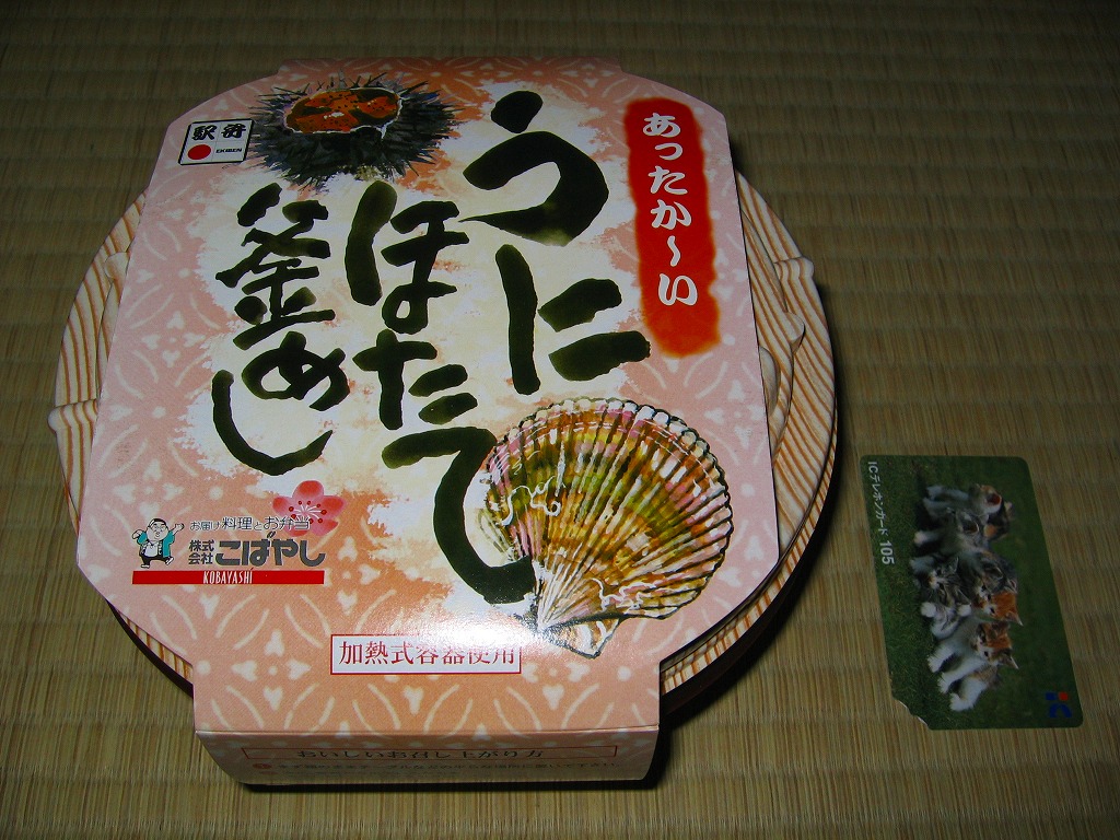 秋冬の駅弁大会シーズンに向けた、2004(平成16)年秋の新商品か。円形の加熱機能付き容器を、ウニとホタテを描いたボール紙の枠にはめる。中身は宮城産ひとめぼれを使ったホタテひじき御飯の上に、蒸しウニと煮ホタテと福神漬をパラパラと載せるもの。暖かいウニというのも変な感じで、価格も少々高いが、全体の風味として駅弁の名前どおりの暖かさを感じる。このシーズンのみの販売か。
