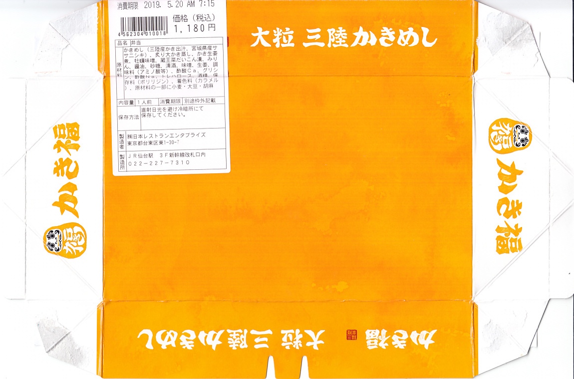 東京都港区のデザイン会社による耐水紙製パッケージでは、商品名とダルマをオレンジ色にアレンジ。ふたの裏側には「かき食う門には福来たる。」というポエムを記す。この箱に直接詰められた中身は、カキのだし汁で炊いた宮城県産ササニシキの御飯に、カキの炙り蒸しと生姜煮を散らし、牡蠣味噌と蔵王菜だいこん漬を添えるもの。
