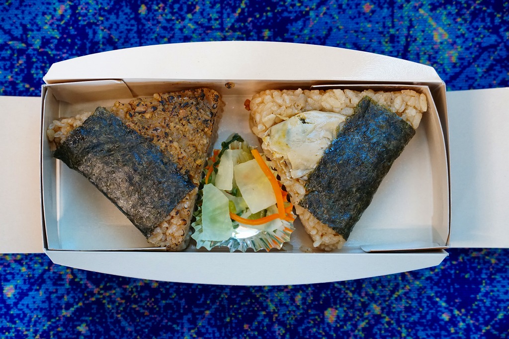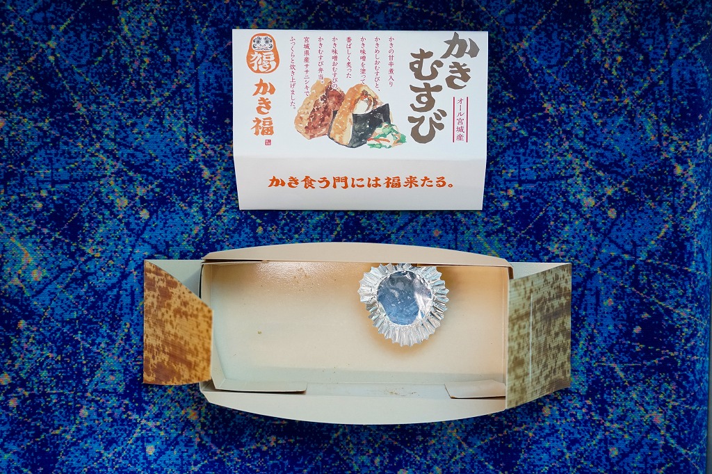 2018(平成30)年の夏に発売か。下記の駅弁「かき福大粒三陸かきめし」の、カキ御飯をおむすびにしたものだろう。白と黒の型押しカキ飯と漬物を、竹皮柄の紙箱に収めていた。2022年までの販売か。