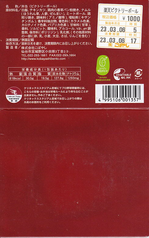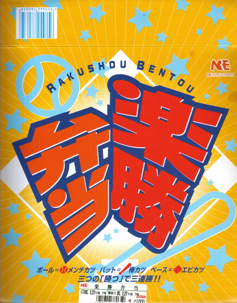 プロ野球「東北楽天ゴールデンイーグルズ」の仙台進出にあやかって、2004(平成16)年12月頃に発売。大きな長方形のボール紙製パッケージには、バットとボールとダイヤモンド(内野)のイラストを描く。中身は日の丸御飯にメンチカツと棒カツとエビカツ、その下にたっぷりの千切りキャベツやフェットチーネを敷き、ポテトフライなどを添えるもの。現存しない模様。