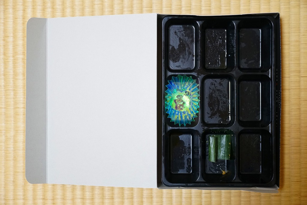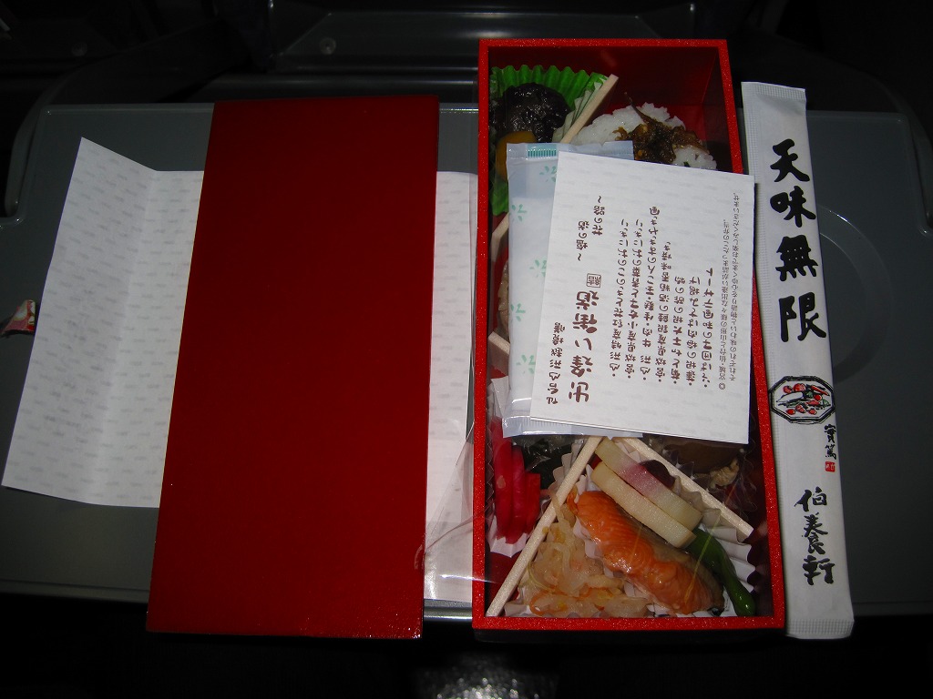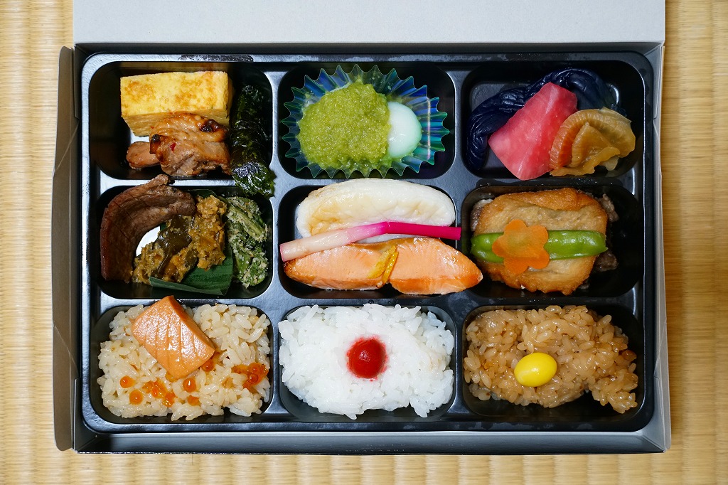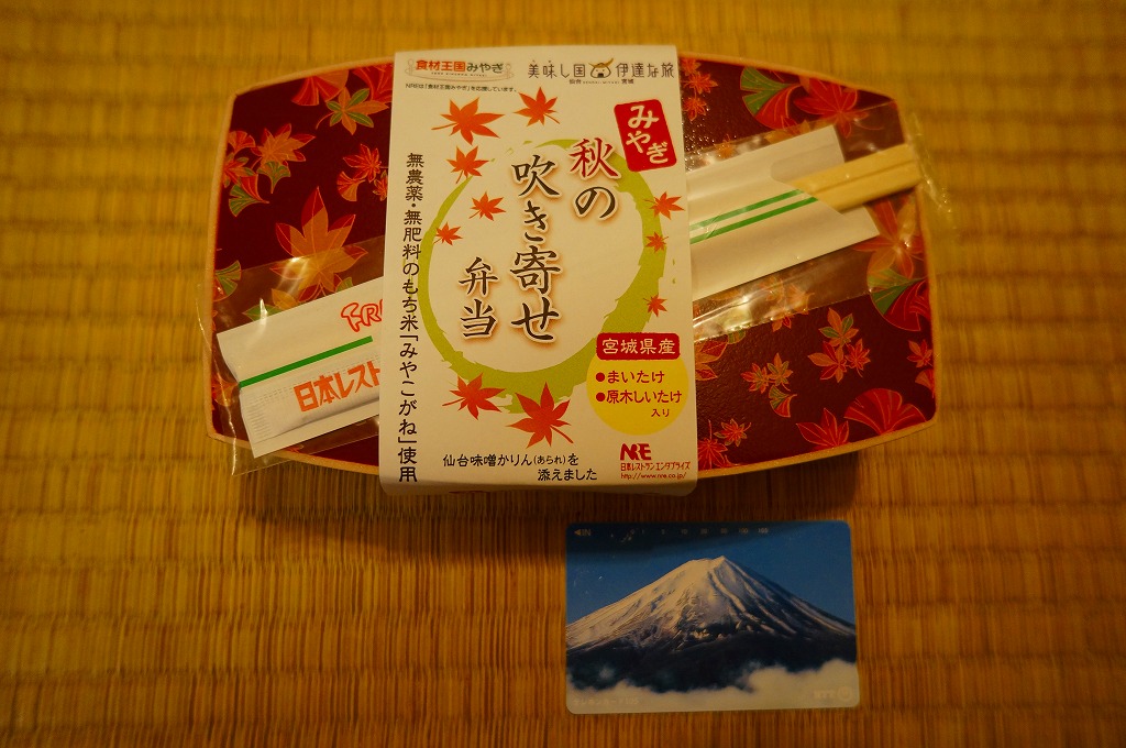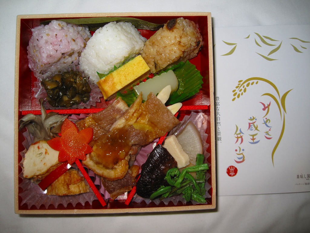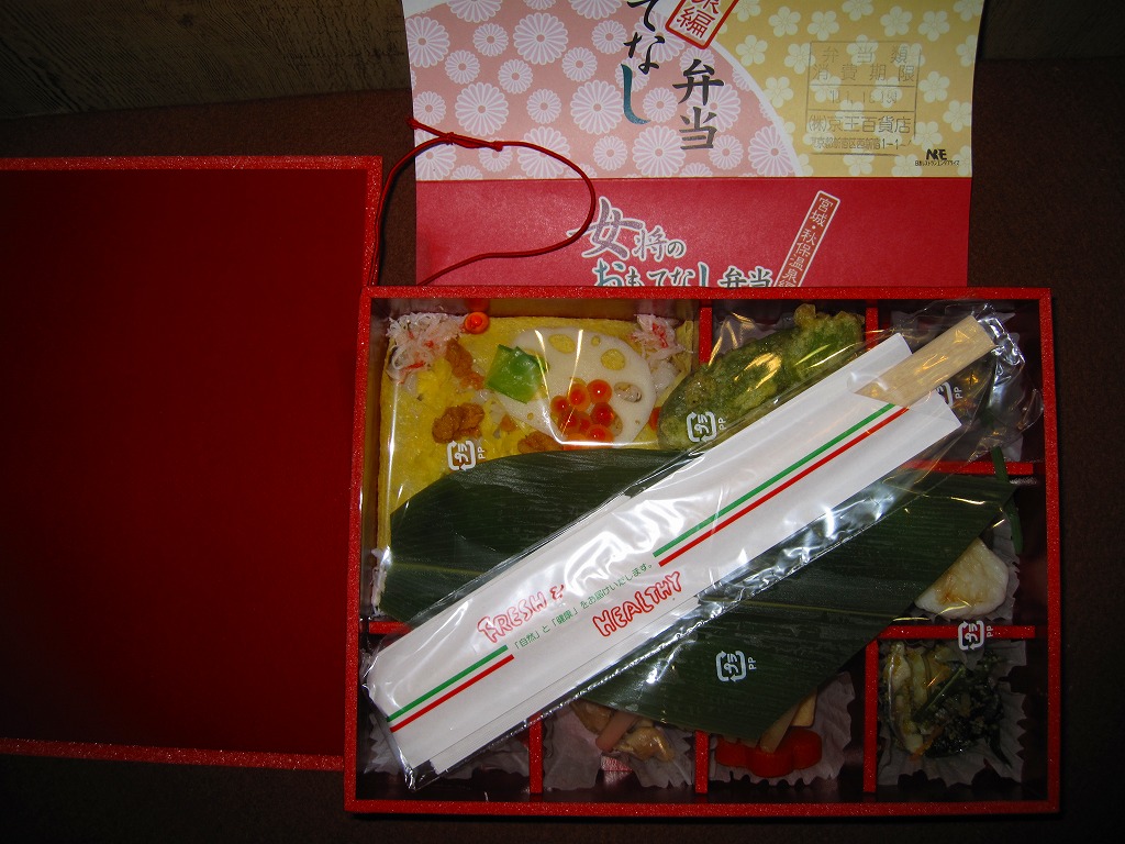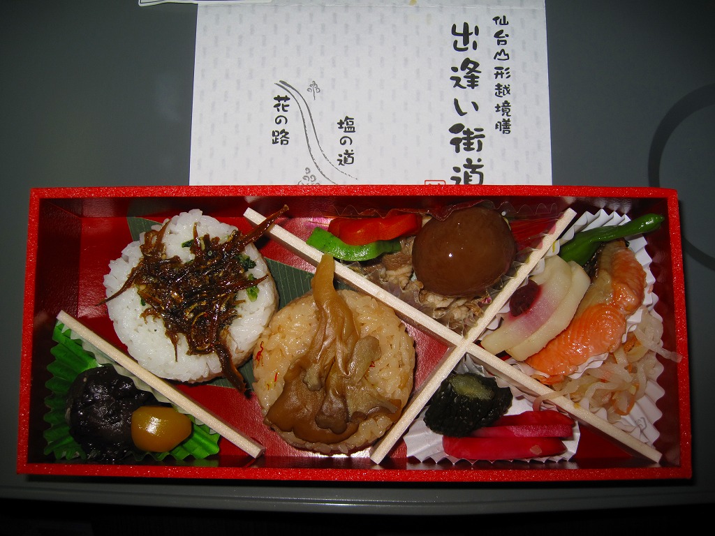 中身は宮城県産ひとめぼれの白飯むすびとひじき飯むすびが各1個と、鮭の酒粕漬け焼、ナスやカボチャなど野菜の素揚げ、昆布佃煮、笹かまぼことカステラ蒲鉾、ミニクッキー2種など。個々の料理に不協和音が聞こえるものの、見栄えと個々の味はきれいな感じ。以後も2015年頃まで販売された模様。
