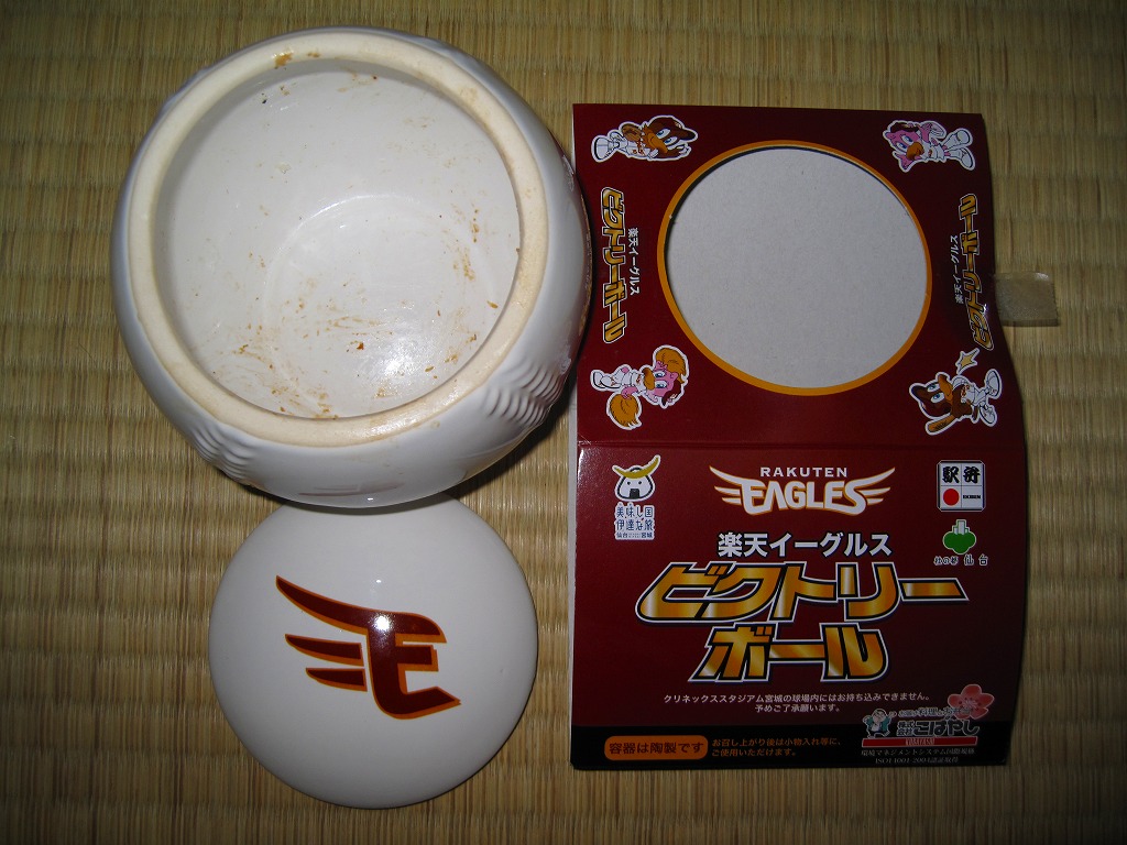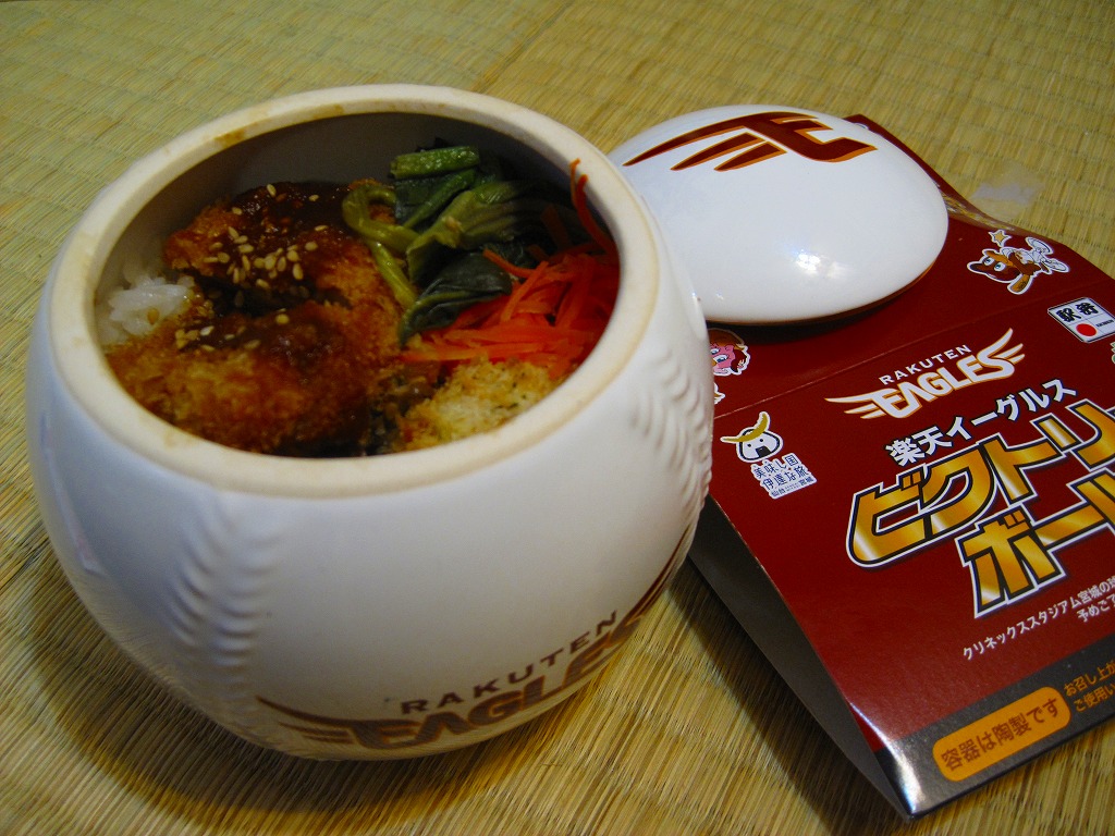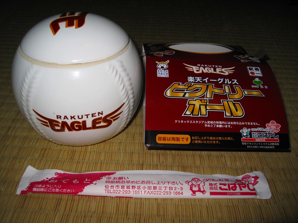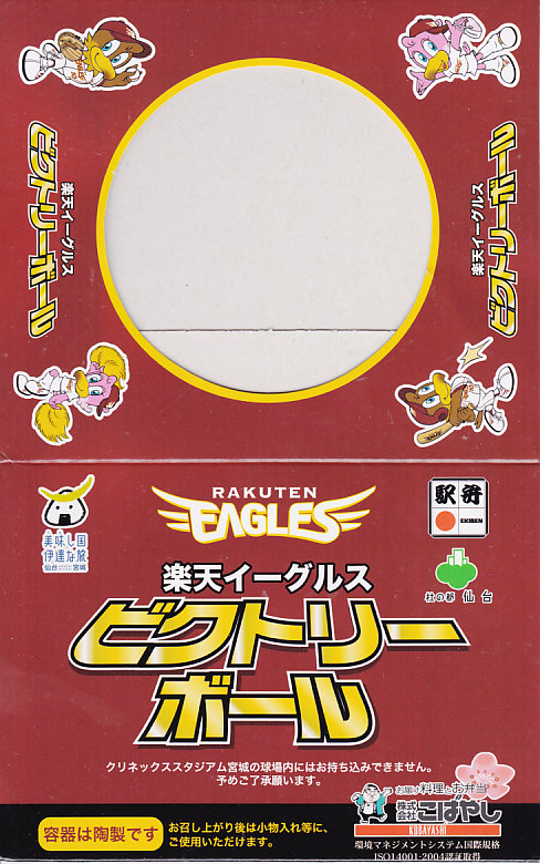 東北新幹線はやぶさ号デビューを記念して、2011(平成23)年3月5〜6日に東京駅で開催された、第13回東日本縦断駅弁大会で発売か。新神戸駅弁「タイガース勝めし」と同じ、野球のボールをもした白い球形の陶器を使用、これに仙台に本拠地を置くプロ野球団「東北楽天ゴールデンイーグルス」の公式ロゴマークをプリントしたうえで、そのイメージカラーに染めたボール紙の枠にはめる。