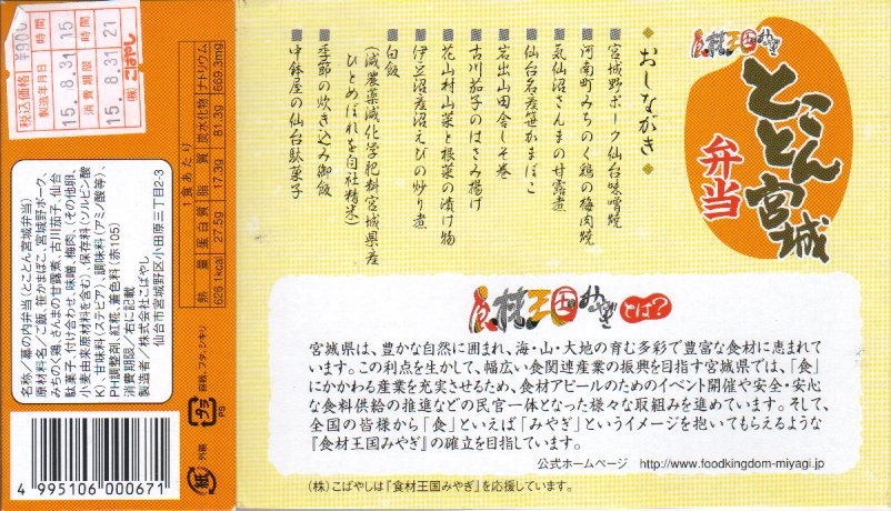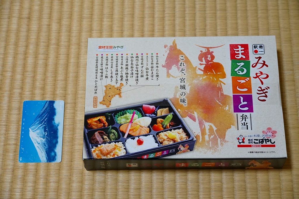 12区画のトレーに入る中身は、日の丸、鮭いくら、カキ、赤飯で4種類の御飯と、フカヒレあんかけ、牛たんコロッケ、もち豚味噌焼、牛肉エリンギ炒め、鶏照焼と玉子焼、サンマ竜田揚、笹蒲鉾と駄菓子など。それぞれが仙台や宮城にちなむことがおしながきで確認でき、これは季節の絵柄を採用した絵葉書を兼ねる。コンセプトに忠実な演出系で、風味も良好。宮城県が「食材王国みやぎ」を打ち出してから、駅弁に限らず宮城の食にしっかりとした筋が通った気がする。2011年頃までの販売か。