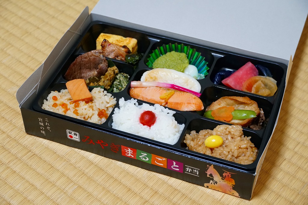 2023(令和5)年6月1日に仙台駅で発売。下記のとおり、似たような名前や中身の駅弁は、過去にも出ていたと思う。専用の紙箱で写真と地名と料理名により紹介する中身は、宮城県産環境保全米ひとめぼれの日の丸御飯、亘理名物はらこ飯、くるみおこわ、A5ランク仙台牛などの煮物と登米(とよま)名物あぶら麩煮、仙台名物牛たん焼きとこごみ胡麻和えと唐辛子、仙台名物笹かまぼこと三陸産銀鮭の柚香焼きと岩出山名産しそ巻き、宮城県産卵の厚焼き玉子と鶏肉の仙台味噌漬焼き、宮城名物ずんだ餅、仙台長茄子漬けと蔵王大根の味噌漬けと大根塩漬、宮城名物ずんだ餅。9区画に20種類以上の料理や食材を詰め込んだ、地理と郷土のお勉強。