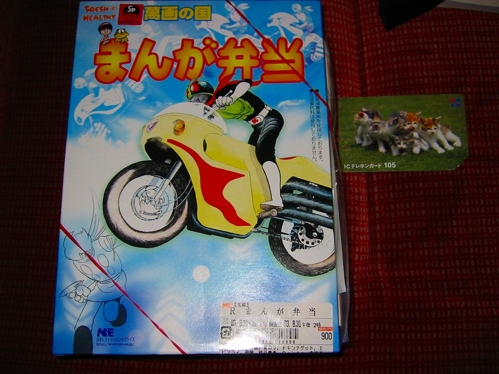 仙石線に登場した石ノ森章太郎キャラクター列車「マンガッタンライナー」に合わせて、仙台駅弁業者別に3種類が発売されたマンガ弁当の日本レストランエンタプライズ版として、2003(平成15)年3月22日に発売。仮面ライダー1号を描いたボール紙のふたを開けると、チキンナゲット・鶏そぼろ・青のり・海苔・かんぴょう・枝豆春巻で描いた、写真のとおり見事な仮面ライダー1号の顔が登場。他の具もソーセージに肉団子に海老フライと子供向け。